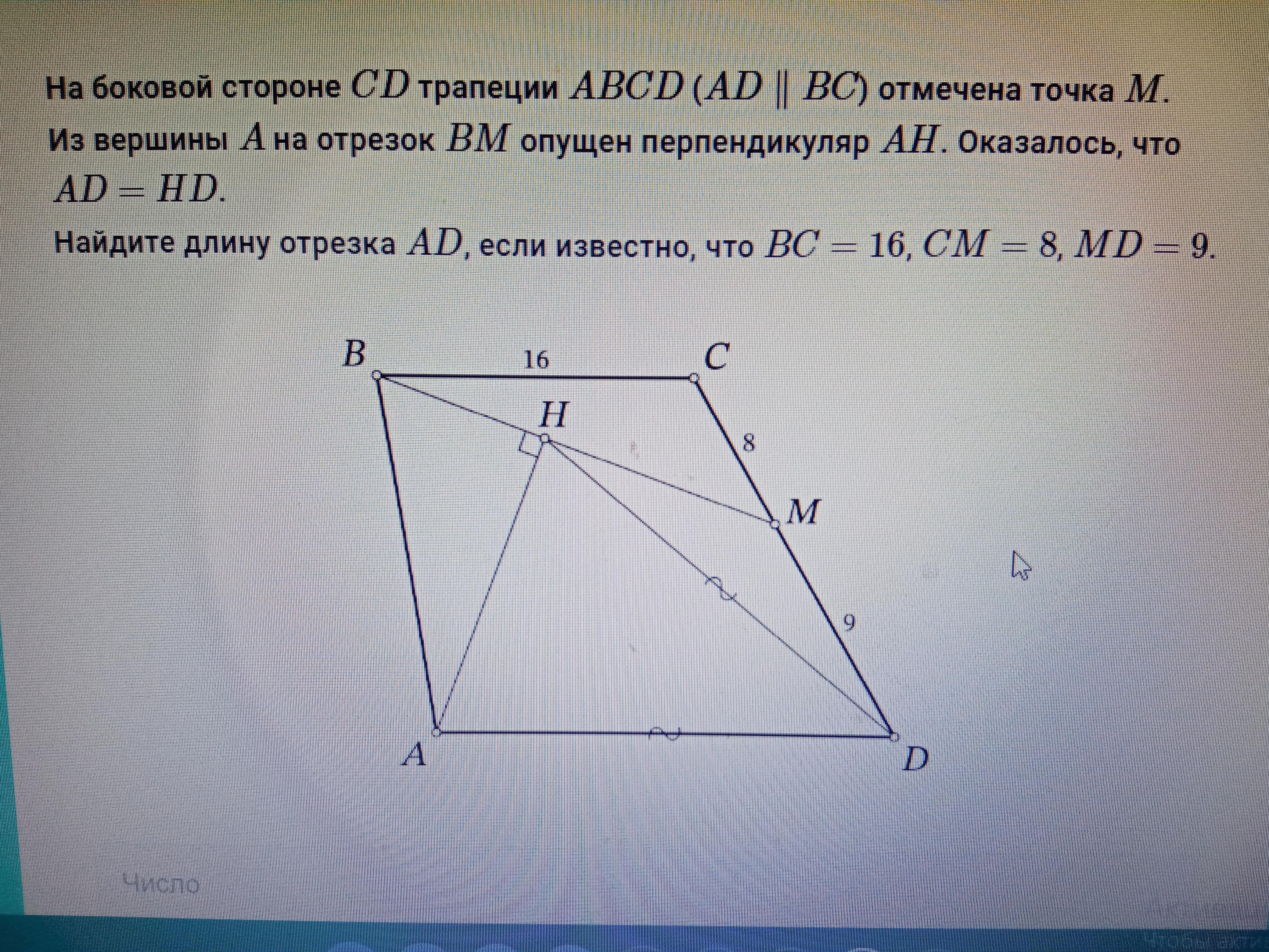 Надо продлить отрезок ВМ до пересечения с продолжением стороны AD в точке Е.