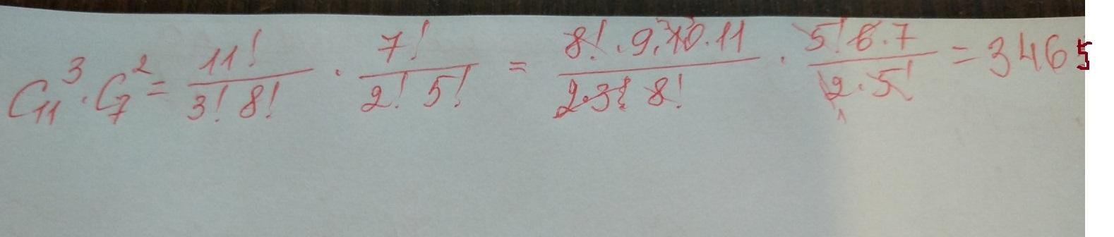 сколькими способами можно составить букет из 11 красных тюльпанов и 7 желтых тюльпанов, если в букете должны быть 3 красных и 2 желтых