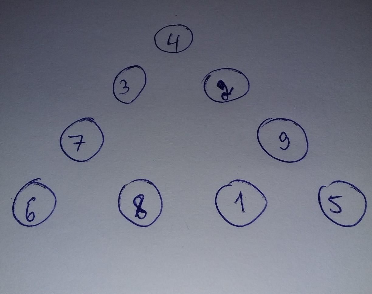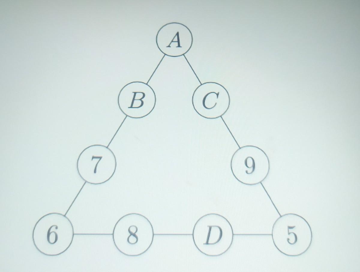 В пяти из девяти кружков на картинке записаны числа 5, 6, 7, 8, 9. Замените цифрами 1, 2, 3, 4 оставшиеся кружки A, B, C, D так, чтобы суммы четырех чисел вдоль каждой из трёх сторон треугольника были одинаковыми