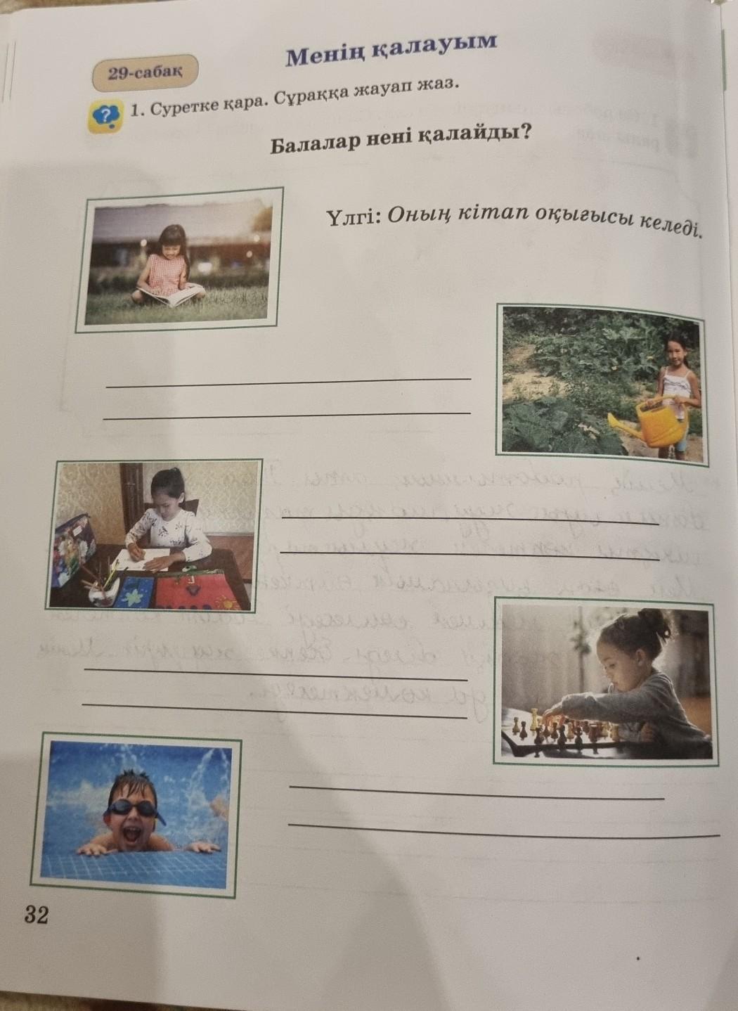 29-сабақ Менің қалауым ? 1. Суретке қара. Сұраққа жауап жаз. Балалар нені қалайды? Үлгі: Оның кітап оқығысы келеді 32