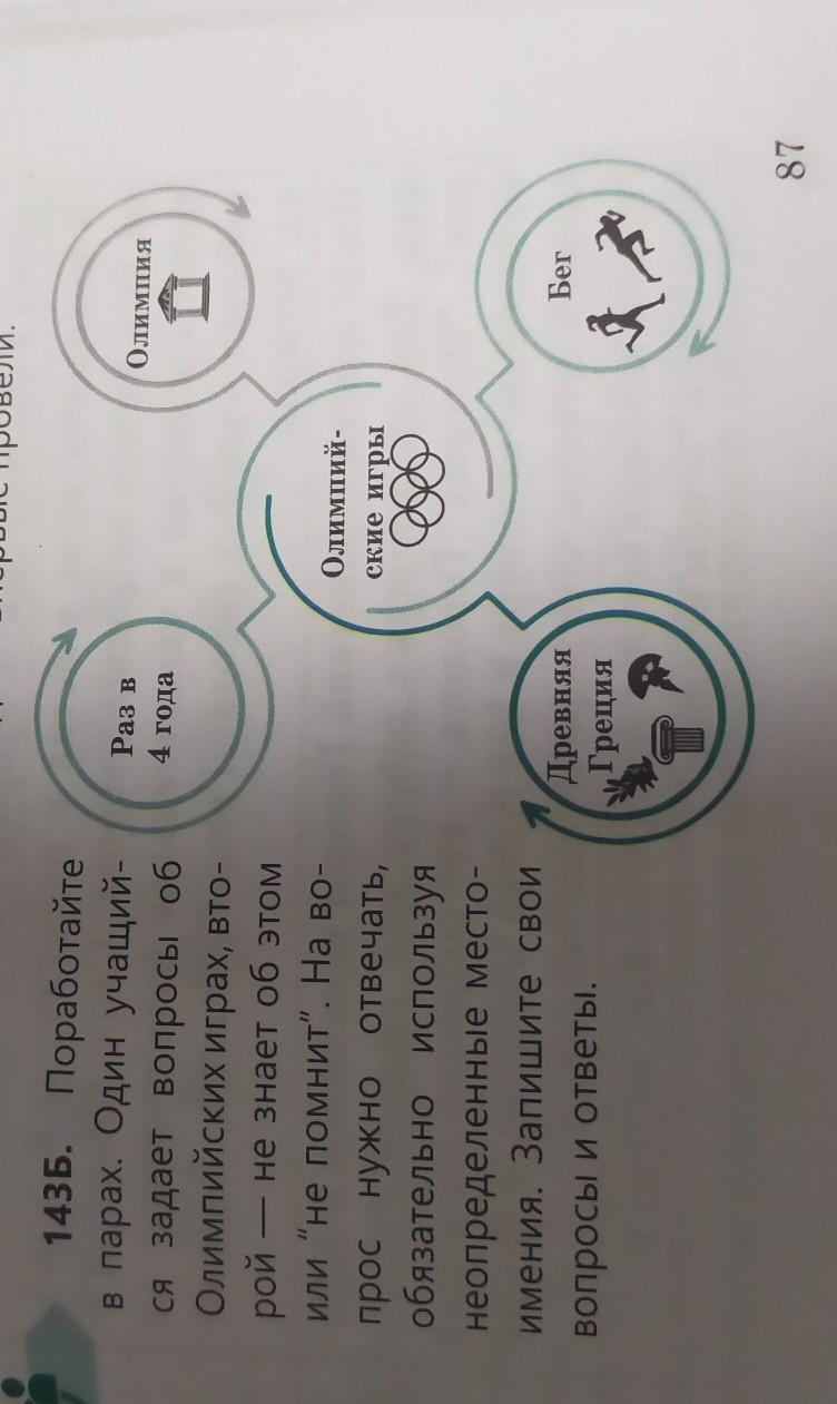143Б. Поработайте в парах. Один учащий- ся задает вопросы об Олимпийских играх, вто- рой не знает об этом или "не помнит". На во- прос нужно отвечать, обязательно используя неопределенные место- имения. Запишите свои Вопросы и ответы.Дам 15 балов срочно