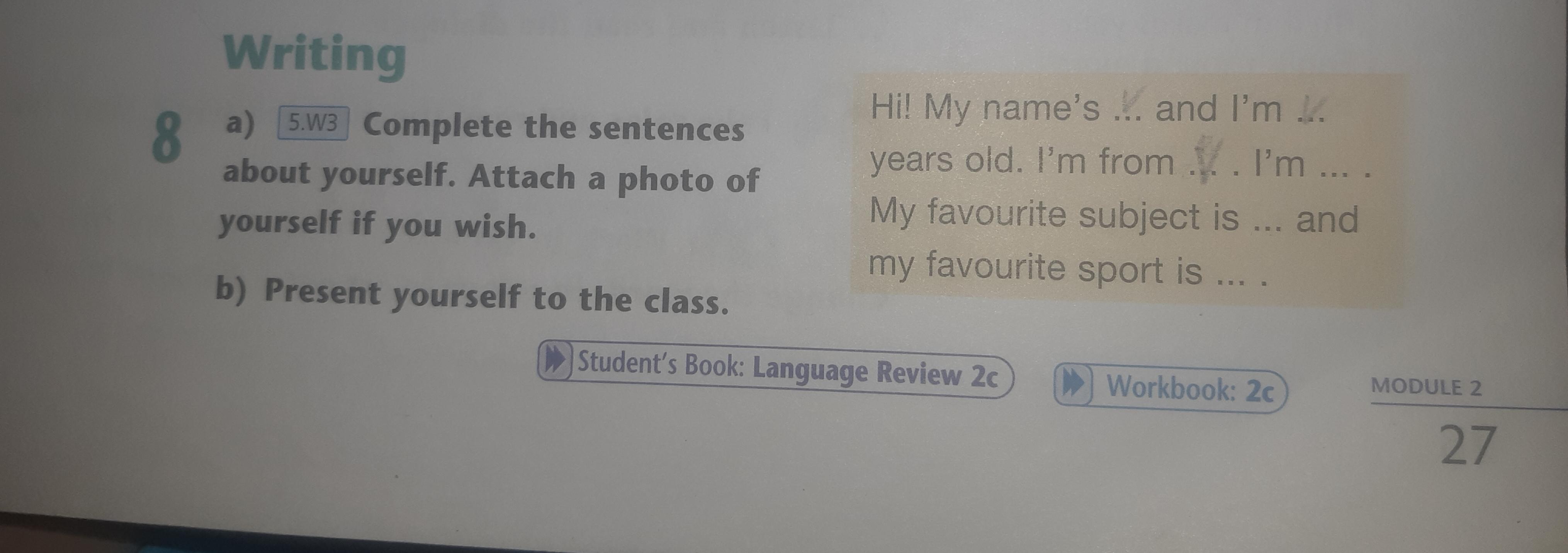 ну допустим смотри, в первом предложении идёт речь, как меня зовут ты должен или должна написать, второе предложение сколько тебе лет, и последнее моя любимая профессия и мой любимы спорт и все))