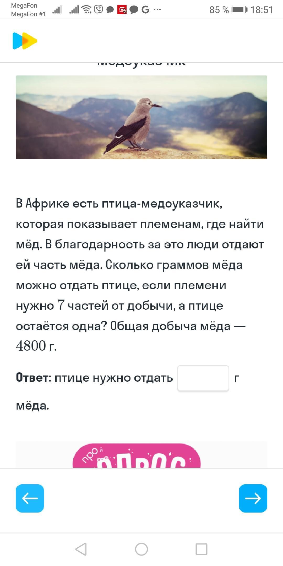 В Африке есть птица медоуказчик которая показывает временам Где найти мёд в благодарность за это люди отдают сейчас мёда сколько граммов мёда можно отдать птицы если племени нужно 7 частей от добычи а птицы остаётся одна общая добыча мёда 4800 г