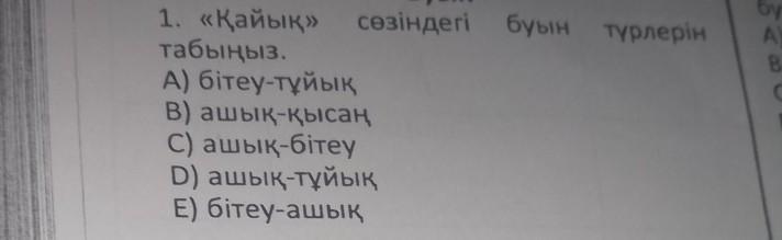 түрлерін Буын 1. «Қайық» сөзіндегі буын табыңыз. А) бітеу-тұйық В) ашық-қысаң C) ашық-бітеу D) ашық-тұйық E) бітеу-ашық n r