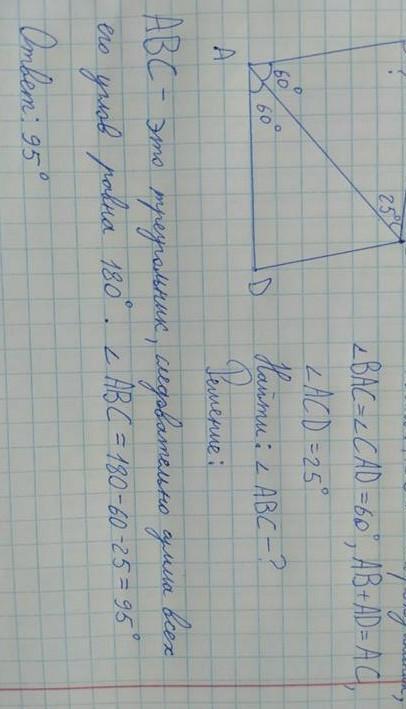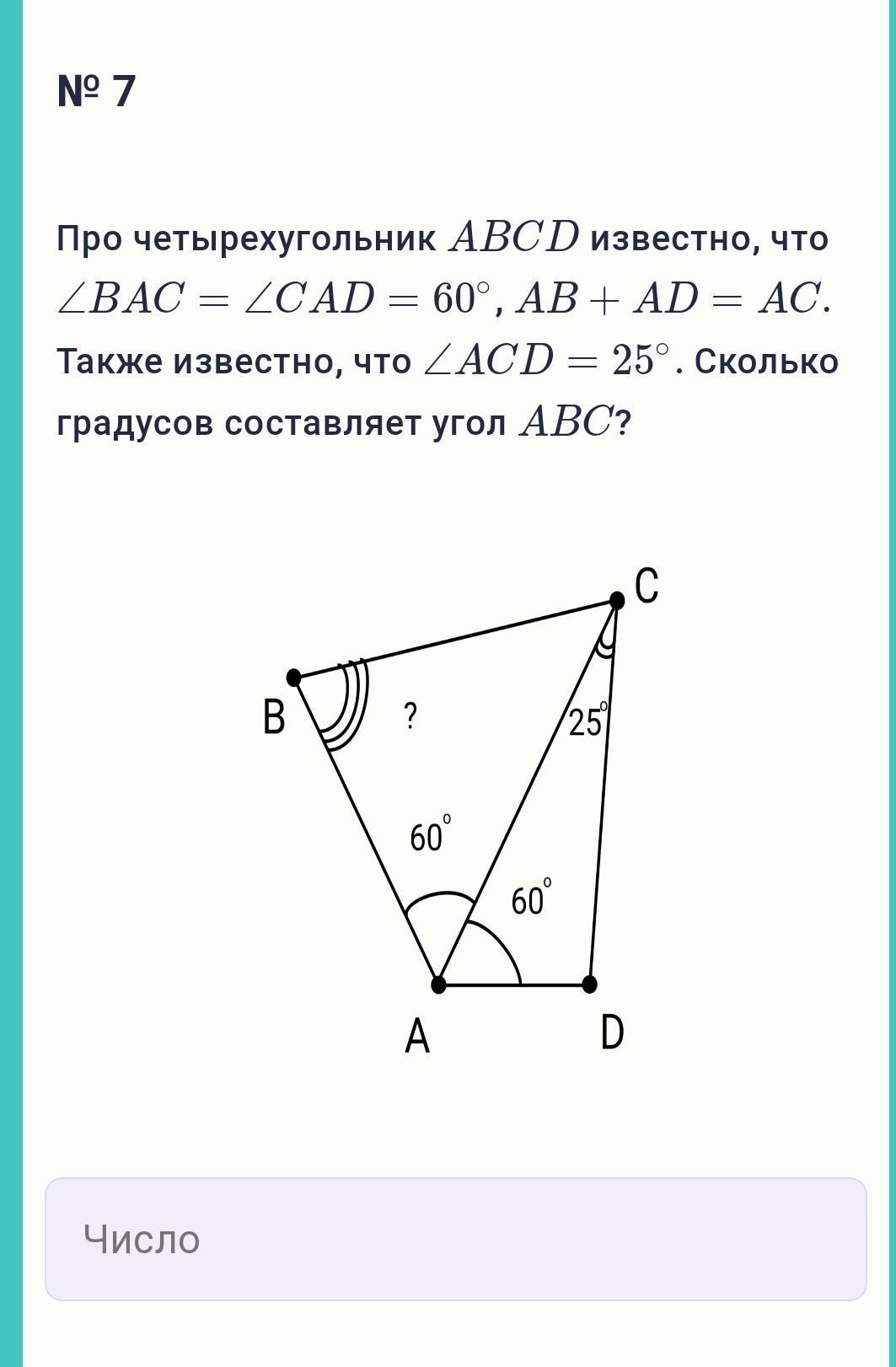 Про четырехугольник ABCD известно, что угол BAC= углу CAD = 60°, AB + AC = 25°. Сколько градусов составляет угол ABC?