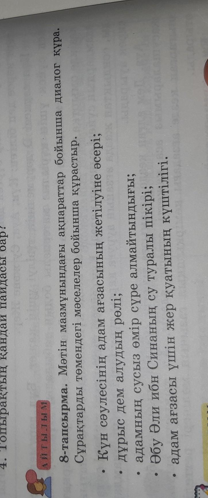 8-тапсырма. Мәтін мазмұнындағы ақпараттар бойынша диалог құра. Сұрақтарды төмендегі мәселелер бойынша құрастыр. Күн сәулесінің адам ағзасының жетілуіне әсері; дұрыс дем алудың рөлі; • адамның сусыз өмір сүре алмайтындығы; Әбу Әли ибн Синаның су туралы пікірі; адам ағзасы үшін жер қуатының күштілігі. срочнооооо