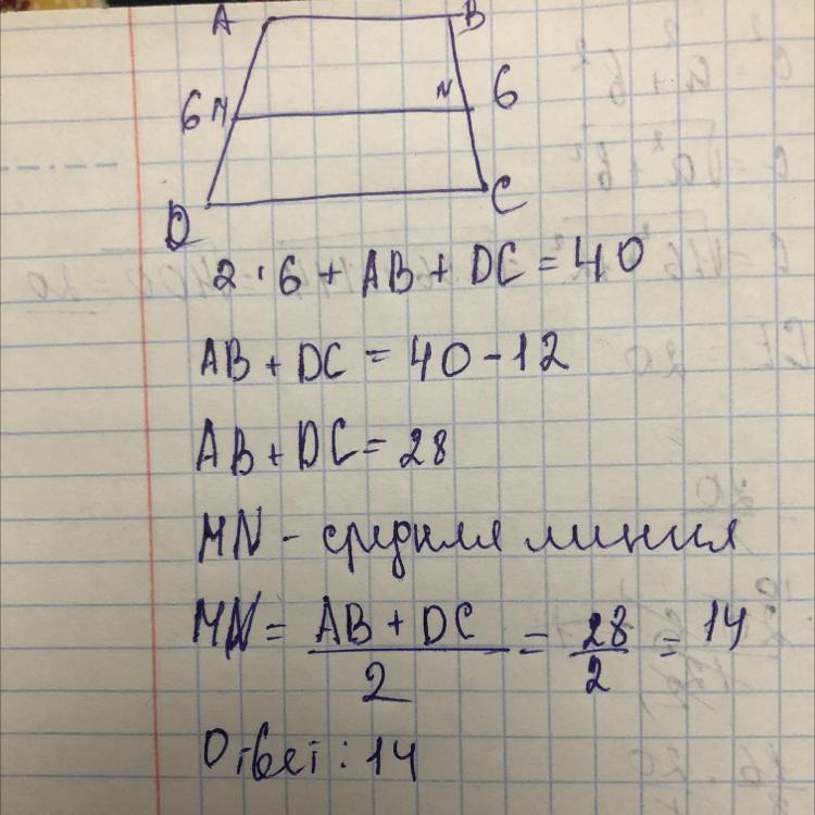 равнобедренной трапеции боковые стороны равны 6.периметр трапеции равен 40.найди среднию линию трапеции.