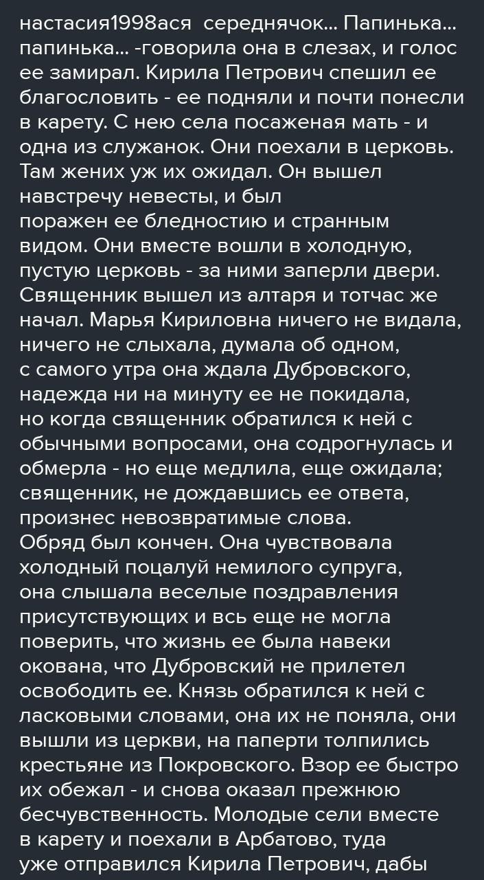 Она вышла замуж за князя Верейского. Вот тебе полный ответ если хочешь)) Маша долго ждала помощи Дубровского и, отчаявшись, решила выйти за князя Верейского. Она почувствовала себя преданной. Раньше при свадьбе дети шли под благословение родителей. И здесь Машу благословил отец, и если бы она ушла с Дубровским, то она бы ослушалась отца, которого очень любила. И это считалось большим грехом. И у Маши не хватило силы воли пойти наперекор отцу, и она вышла замуж за князя.