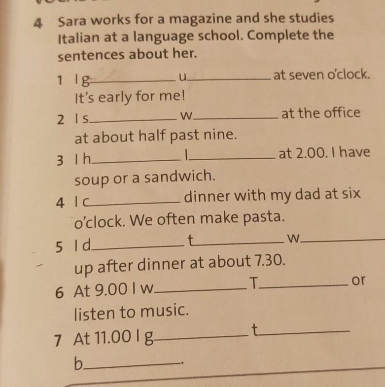 4 Sara works for a magazine and she studies d Italian at a language school. Complete the sentences about her. 1 ig at seven o'clock. It's early for me! 2 15. W. at the office at about half past nine. . at 2.00. I have soup or a sandwich. 4 1c dinner with my dad at six o'clock. We often make pasta. t. W. up after dinner at about 7.30. 6 At 9.00 1 w. Т. or listen to music. 7 At 11.001g t b. 5 Id.