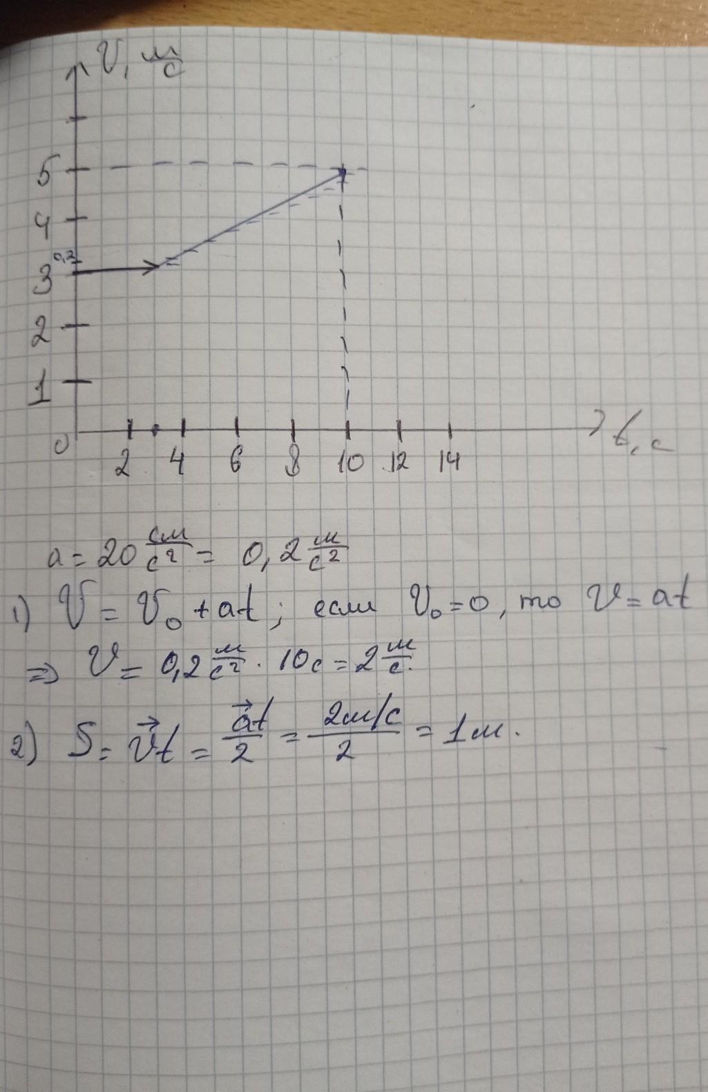 Тело движется равномерно со скоростью 3 м/с в течение 5 с, после чего получает ускорение 20 см/с^2 и движется ещё 10 с Постройте график скорости, определите скорость в конце пути и пройденный телом путь.