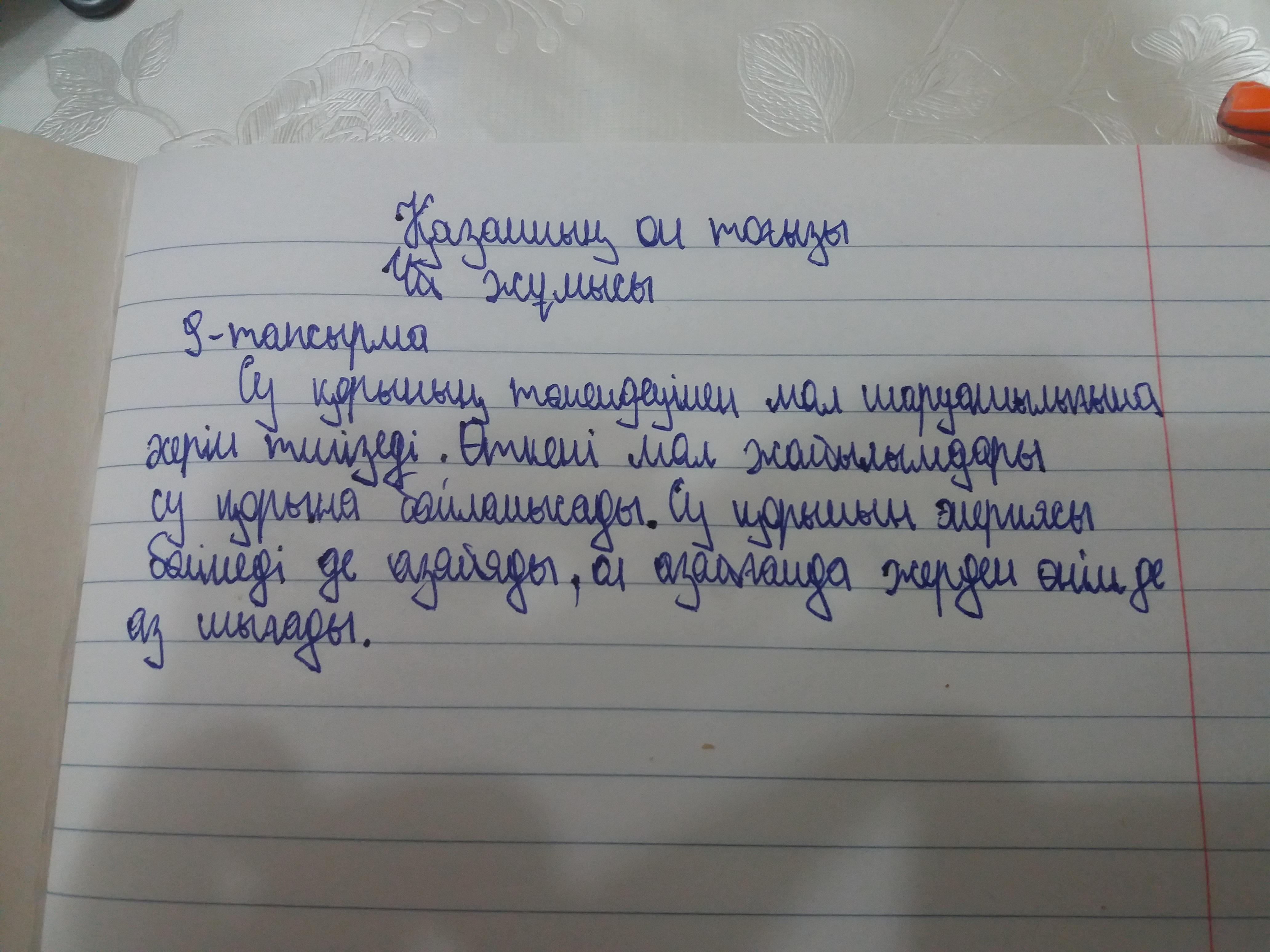9 -тапсырма. Диалогтегі 4 үнқатымды монологқа айналдырып жаз. Үлгі: Диалог: Алуа: — Су қорының төмендеуі ауыл шаруашылығына әсер ете ме? Дана: Әрине, Алуа. Су қорының төмендеуінен мал жайылымдары тозады. Ол ауыл шаруашылығына да кері әсер етеді. Алуа: Рақмет. Сенен көп мәлімет алдым. Сонда энергияның көп бөлінуінен жердегі су қоры азаяды екен. Су азайса, жерден өнім шықпайды. Монолог: Су қорының төмендеуінен мал жайылымдары тозады. Су қорының төмендеуі ауыл шаруашылығына да кері әсер етеді. Энергияның көп бөлінуінен жердегі су қоры азаяды. Су азайғанда жерден өнім шықпайды