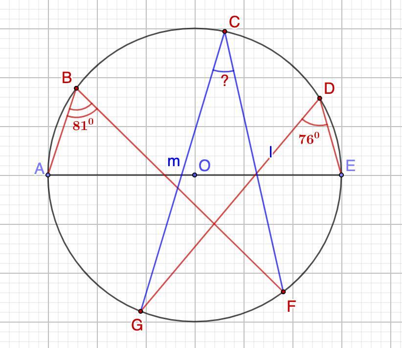 На окружности по часовой стрелке расположены точки A,B,C,D,E,F,G, как изображено на рисунке. Известно, что AE — диаметр окружности. Также известно, что ∠ABF=81∘, ∠EDG=76∘. Сколько градусов составляет угол FCG?