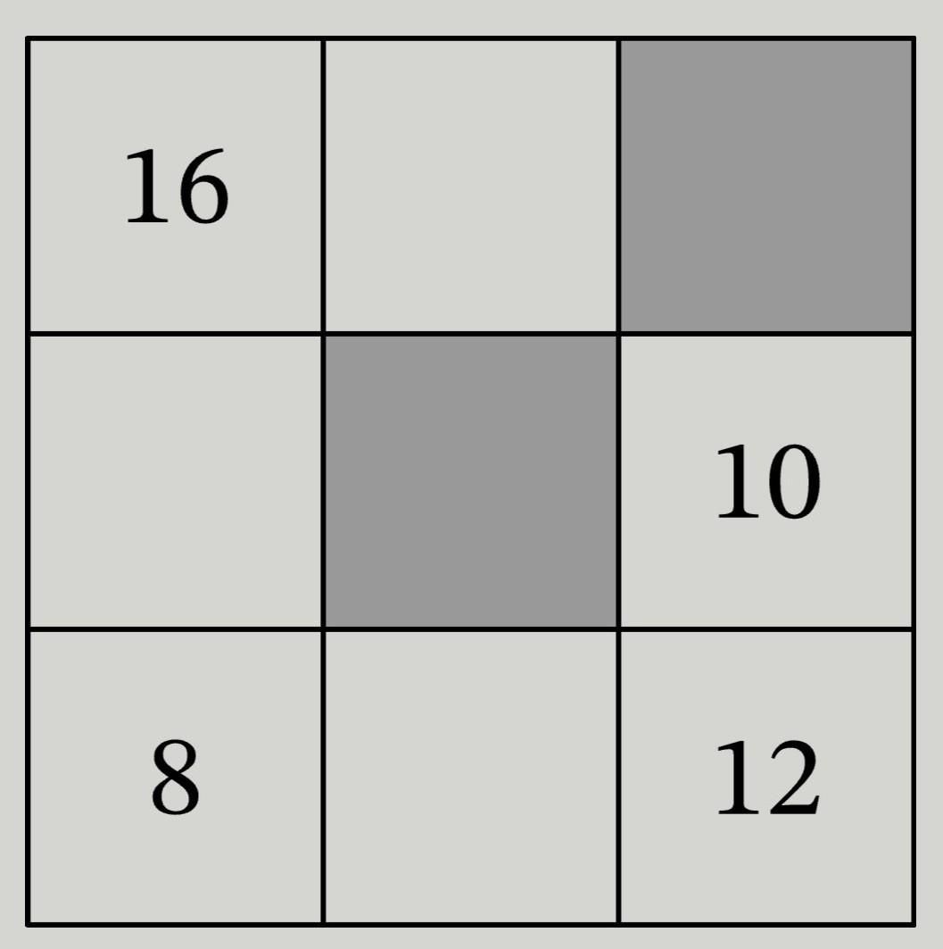 В клетках квадрата расставили числа так, что суммы чисел в каждой вертикали, горизонтали и каждой диагонали из трёх клеток равны. Затем некоторые числа скрыли. Чему равна сумма чисел в двух закрашенных клетках?