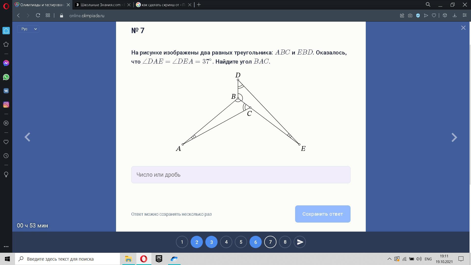 На рисунке изображены два равных треугольника: ABC и EBD. Оказалось, что ∠DAE=∠DEA=37∘. Найдите угол BAC.СРОЧНОООО!!!!!!!!!!!!!!