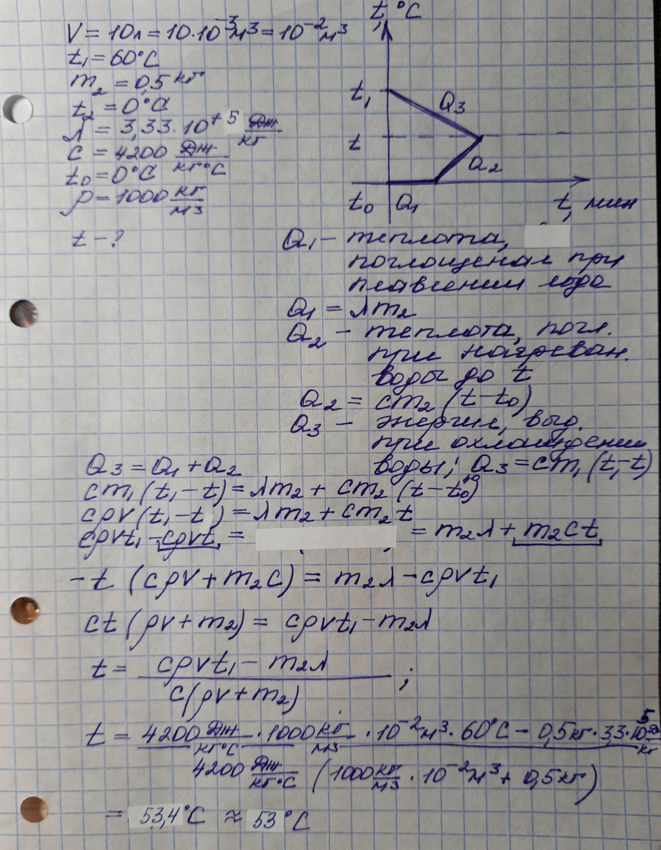 в сосуд с водой объемом 10 л при температуре 60°C опускают лед массой 500 г при температуре 0°C.Чему равно значение конечной температуры воды? ужельная теплота плавления льда 3,33×10-6 дж/кг .удельная теплоемкость воды равна 4200 дж/кг/°C. плотность воды 1000 кг/м3