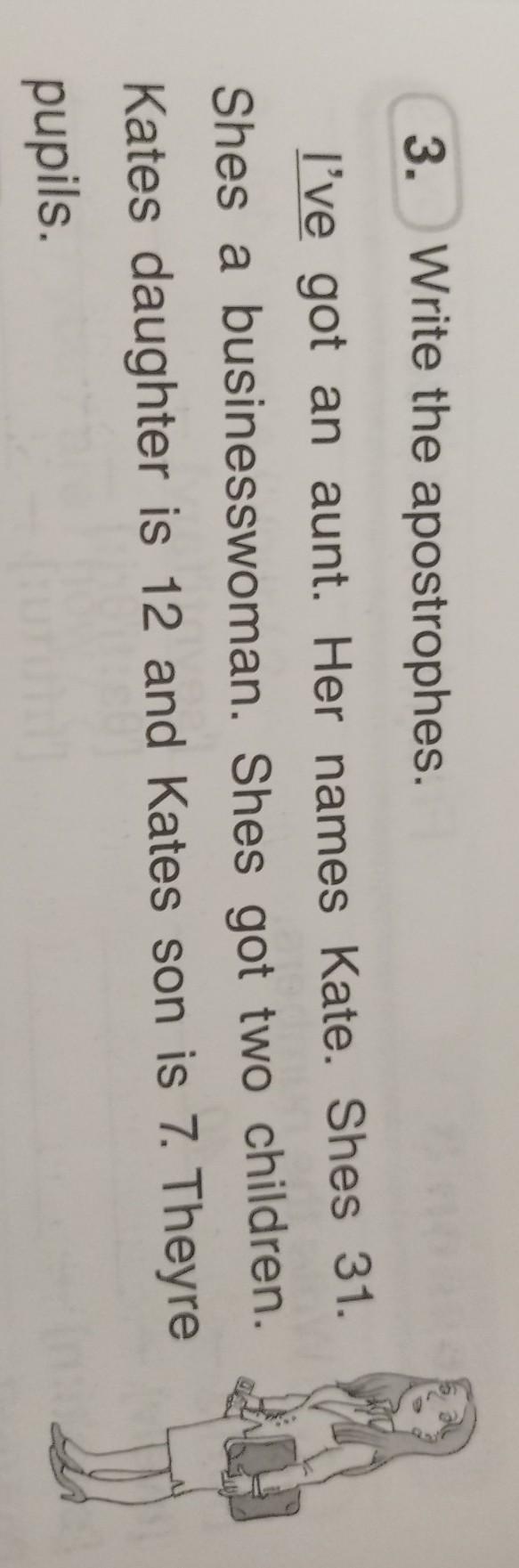 I've got an aunt. Her name's Kate. She's 31. She's a businesswoman. She's got two children. Kate's daughter is 12 and Kate's son is 7. They're pupils.