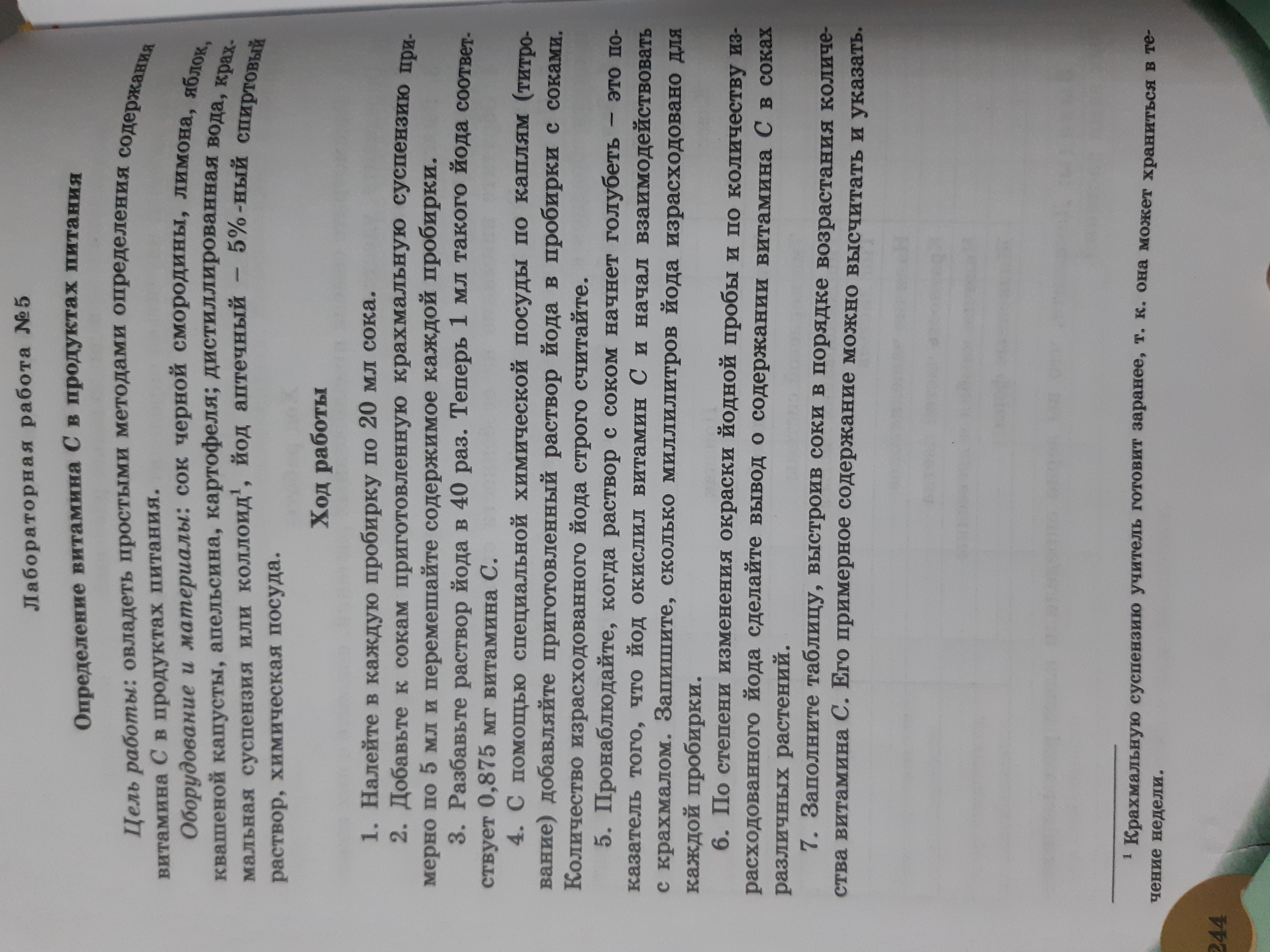 Оборудования и материалы : сок черной смородины, лимона, яблок, квашеной капусты, апельсина, картофеля ; дистиллированная вода, крахмальная суспензия или коллоид¹, йод аптечный - 5%-ный спиртовый раствор, химическая посуда.