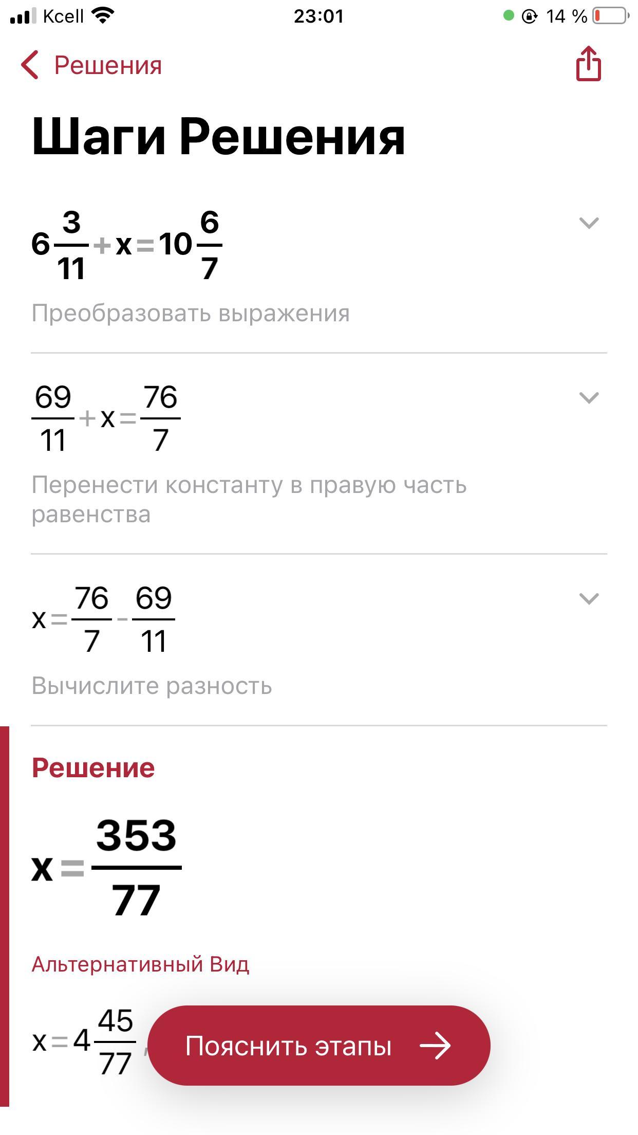 х = (10 - 6) + (66/77 - 21/77)