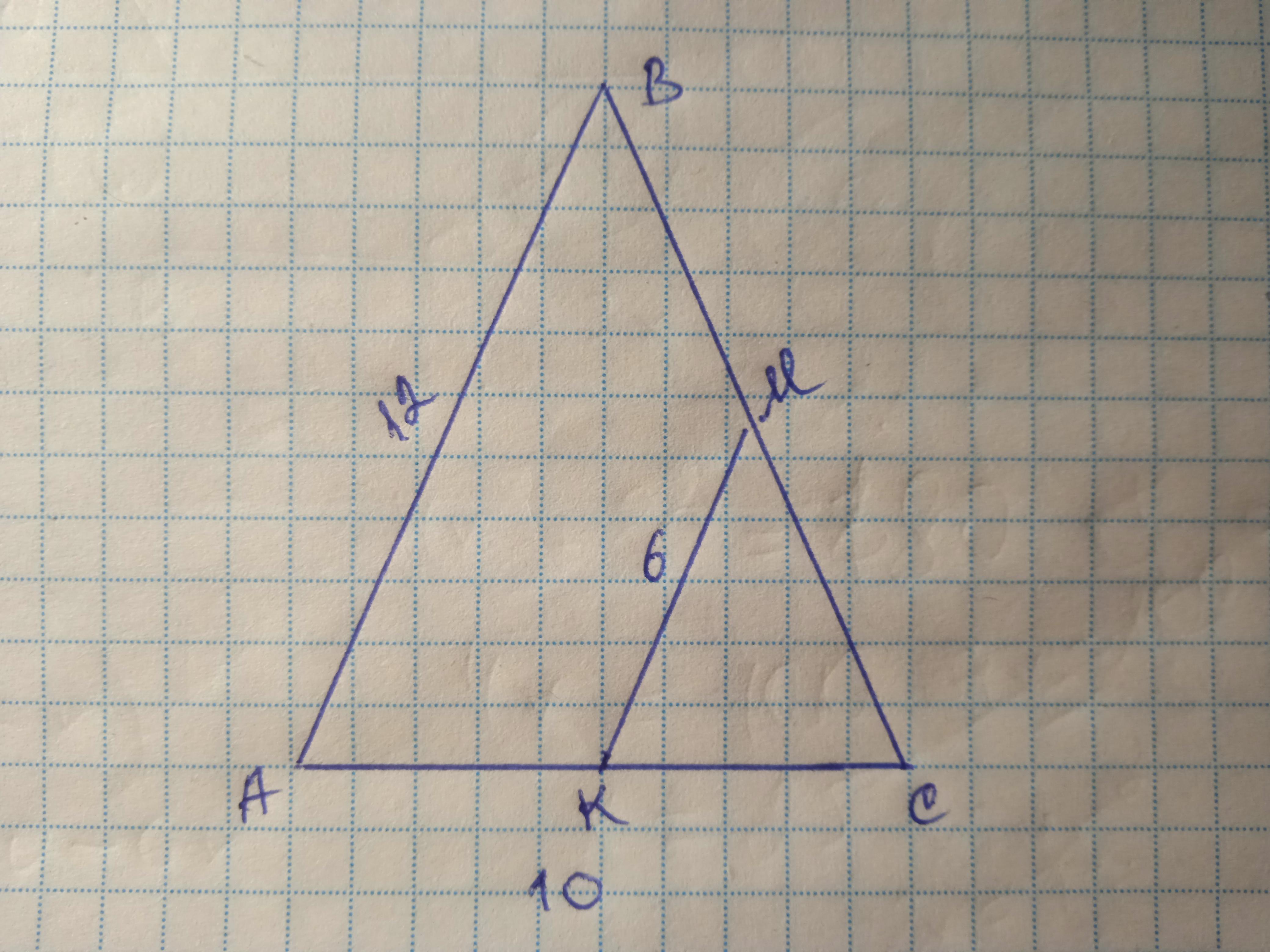 Дано: ΔАВС, АВ=ВС, АС=10 см, Р=34 см. КМ - средняя линия. Найти КМ.