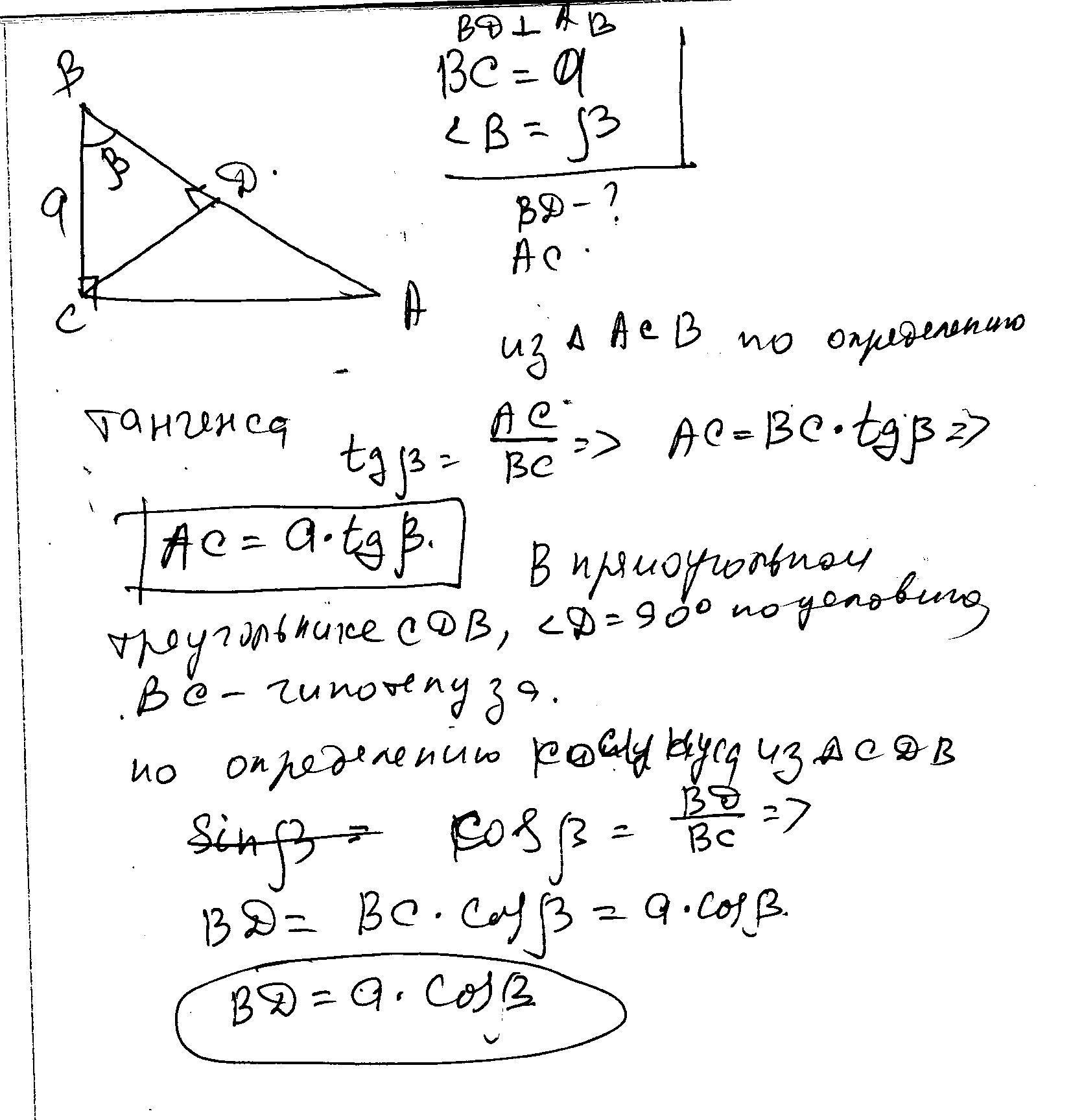 в прямоугольном треугольнике ABC катет BC =α, угол B=β. из вершины прямого угла на гипотенузе опущена высота CD. найдите 1)AC 2) BD