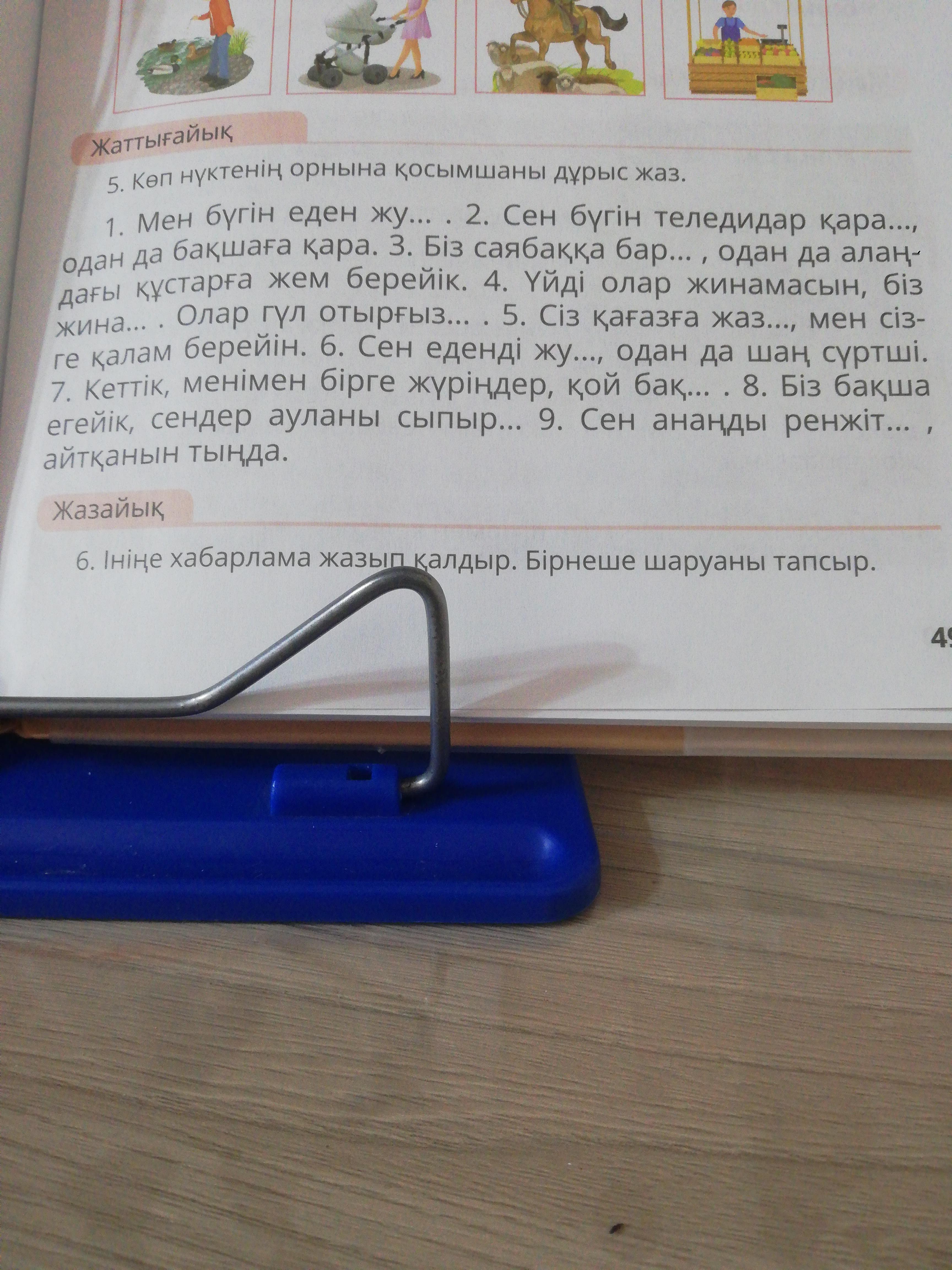 1.Мен бүгін еден жудым.Сен бүгін теледидар қарадың,одан да бақшаға қара.3.Біз саябаққа бармай,одан да алаңдағы құстарға жем берейік.4.Үйді олар жинамасын,біз жинайық.Олар гүл отырғызсын.5.Сіз қағазға жазыңыз,мен сізге қалам берейін.6.Сен еденді жумай,одан да шаң сүртші.7.Кеттік, менімен бірге жүріңдер,қой бағамыз.8.Біз бақша егейік,сендер ауланы сыпырыңдар.9.Сен анаңды ренжітпей,айтқанын тыңда