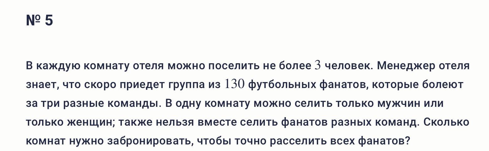 футбольных фанатов, которые болеют за три разные команды. В одну комнату можно селить только мужчин или только женщин; также нельзя вместе селить фанатов разных команд. Сколько комнат нужно забронировать, чтобы точно расселить всех фанатов?
