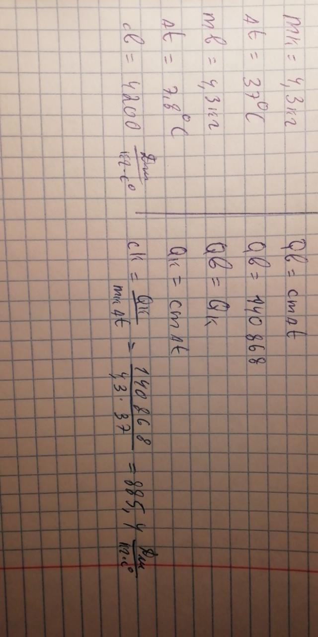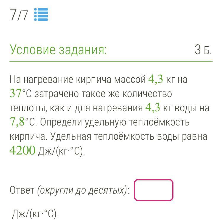 На нагревание кирпича массой 4,3 кг на 37°C затрачено такое же количество теплоты, как и для нагревания 4,3 кг воды на 7,8°C. Определи удельную теплоёмкость кирпича. Удельная теплоёмкость воды равна 4200 Дж/(кг·°C).