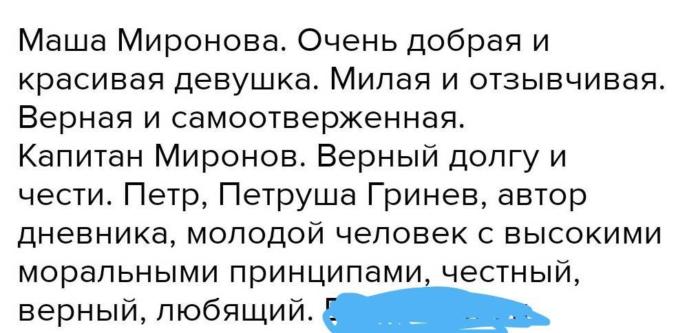 Капитан Миронов. Верный долгу и чести. Петр, Петруша Гринев, автор дневника, молодой человек с высокими моральными принципами, честный, верный, любящий. В повести он превращается из безответственного недоросля в человека, которые отвечает за свои поступки, и может нести ответственность за других.