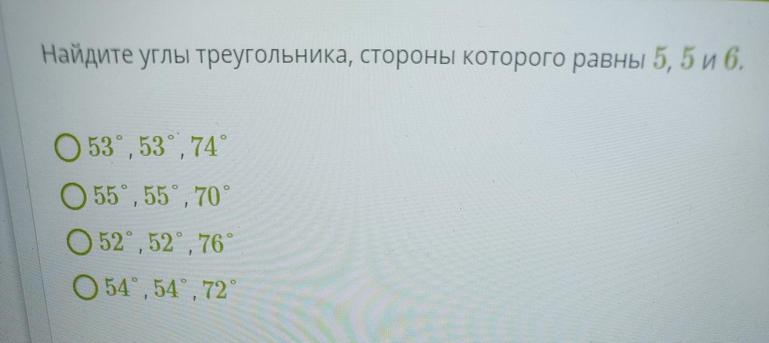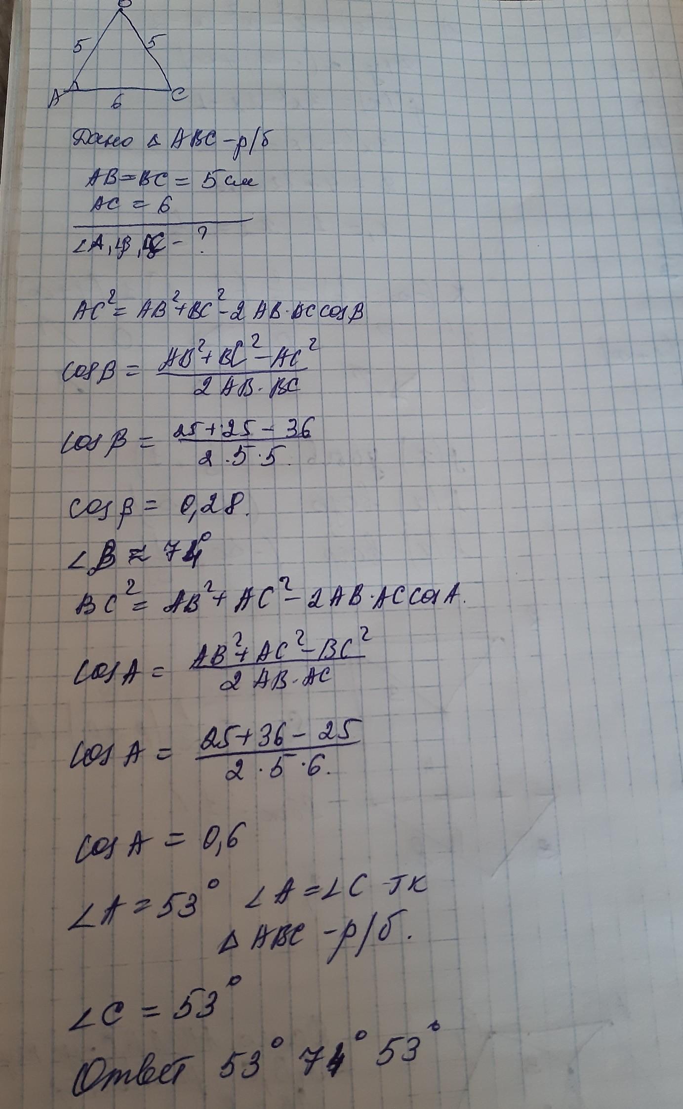 Найдите углы треугольника, стороны которого равны 5, 5 и 6.