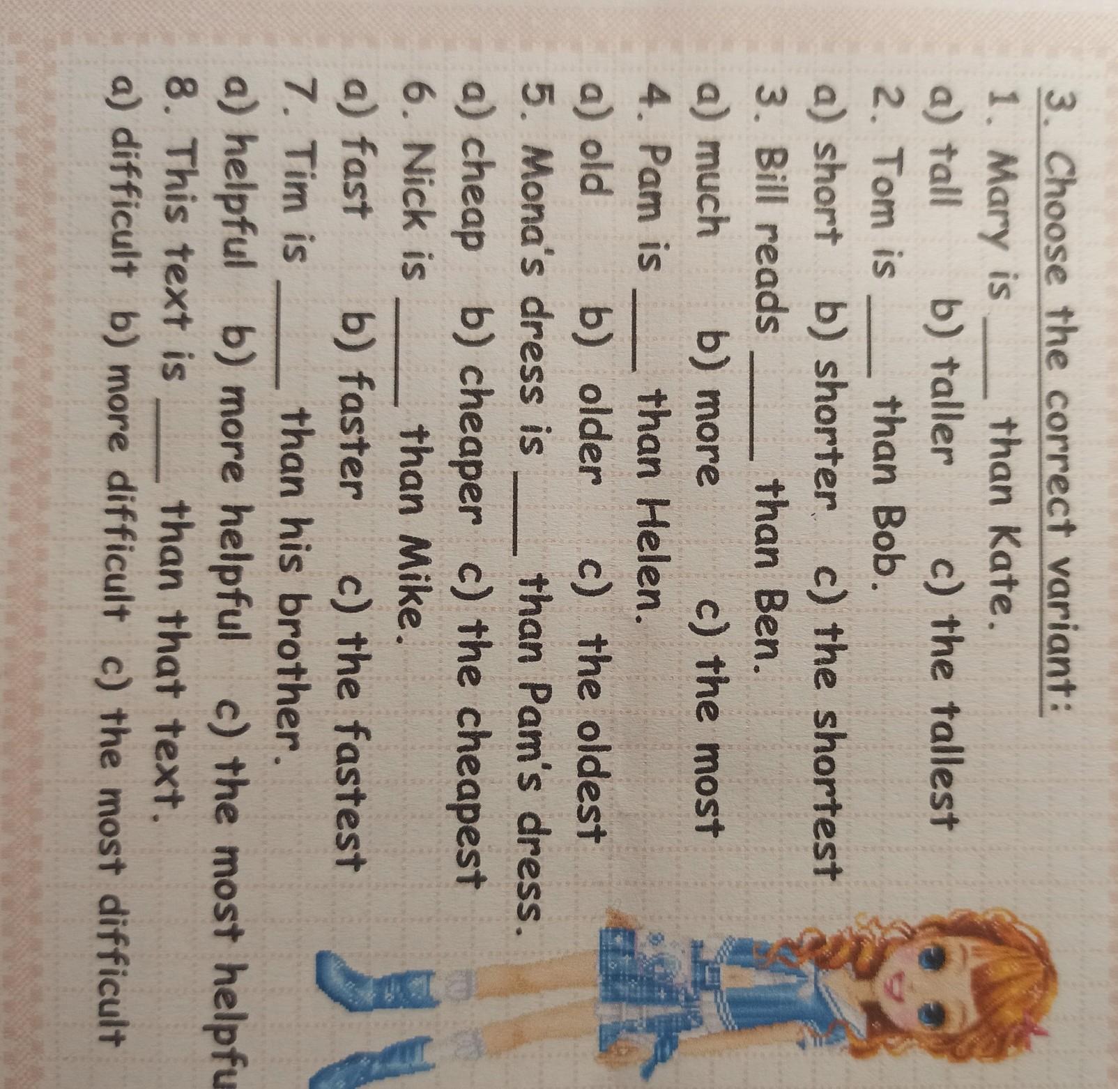 1 tall 2 short 3 more 4 older 5 the cheapest 6 fast 7 the most helpful 8 more difficult