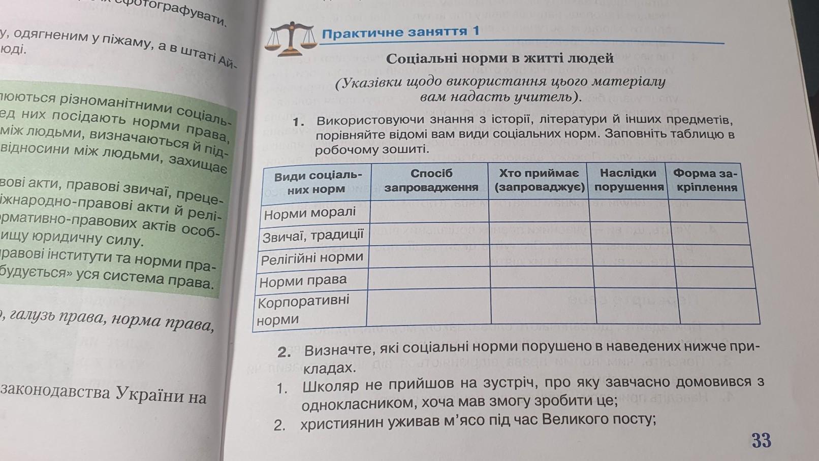 (Указівки щодо використання цього матеріалу вам надасть учитель). 1. Використовуючи знання з історії, літератури й інших предметів, порівняйте відомі вам види соціальних норм. Заповніть таблицю в робочому зошиті. Види соціаль- них норм Спосіб запровадження Хто приймає Наслідки Форма за- (запроваджує) порушення кріплення Норми моралі Звичаї, традиції Релігійні норми Норми права Корпоративні Норми 2. Визначте, які соціальні норми порушено в наведених нижче при