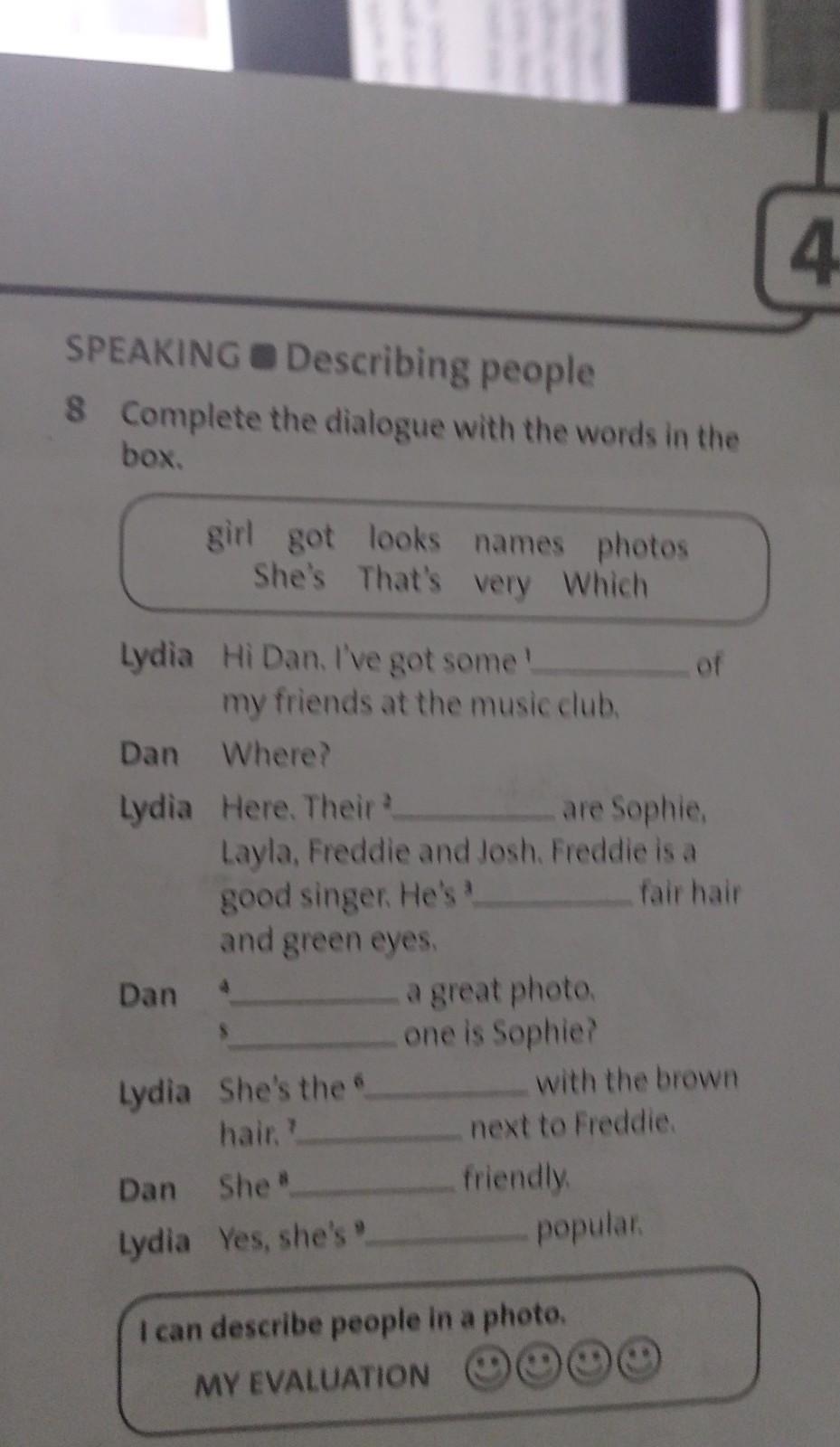 SPEAKING Describing people 8 Complete the dialogue with the words in the box girl got looks names photos She's That's very Which Lydia Hi Dan. I've got some! of my friends at the music club. Dan Where? Lydia Here. Their are Sophie, Layla, Freddie and Josh. Freddie is a good singer. He's fair hair and green eyes Dan 4 a great photo one is Sophie? Lydia She's the with the brown next to Freddie Dan She friendly Lydia Yes, she's popular hair.