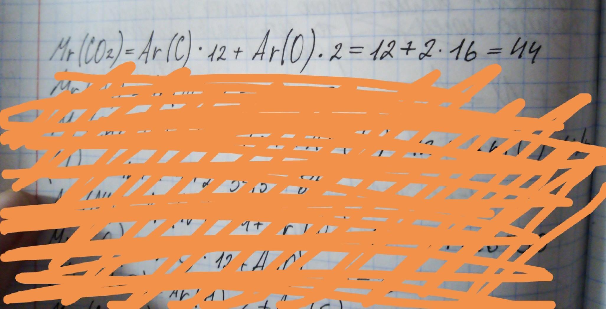 Mr — это молекулярная масса вещества (в этом случае CO2). Чтобы найти молекулярную массу вещества, нужно сложить атомные массы (Ar) каждого вещества. Атомную массу можно найти в таблице Менделеева. Найдём массу углерода (он находится в 4-й группе), рядом с данным элементом написано число 12,011, нам нужно округлить это до целого числа (правила округления:если после запятой стоит 0, 1, 2, 3 или 4, то округляем в меньшую сторону, а если стоит 5 и больше, округляем в большую сторону, исключение составляет хлор (Cl), его относительная атомная масса равна 35, 5). Итак, атомная масса углерода 12,011, округляем в меньшую сторону => Ar(C)=12. Дальше смотрим относительную атомную массу кислорода ( он в 6 группе). Атомная масса кислорода равна 15,999. Округляем и получаем 16. Осталось только сложить полученные числа. Но после кислорода стоит индекс 2. Это значит, что в данном веществе 2 атома кислорода. Следовательно его атомную массу (16) нужно умножить на 2. !!! Этот индекс относится только к элементу, после которого он стоит. А если индекс стоит после скобки, в которой несколько элементов, то этот индекс относится к каждому элементу. Если после элементов в скобках уже стоят индексы, то нужно умножить индекс, который после элемента на тот, который за скобкой. И умножить атомную массу элемента на получившеесе число!!!