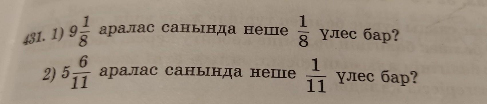 1 19а 431. 1) 9 аралас санында неше 2) 5 аралас санында неше 1 үлес бар? 8 1 11 үлес бар? 6 11 помогите пж