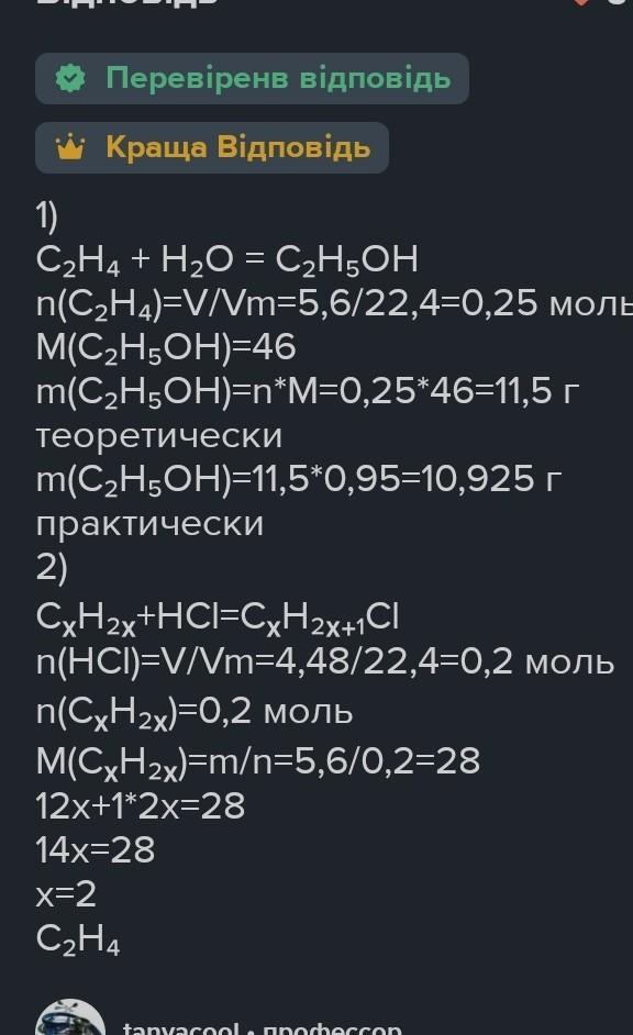 СРОЧНО ДАЮ 60 БАЛЛОВ яка маса етанолу утворюється в результаті гідратації етану об'ємом 5,6л(н.у) за умови що вихід продукту від теоретичного становить 95%