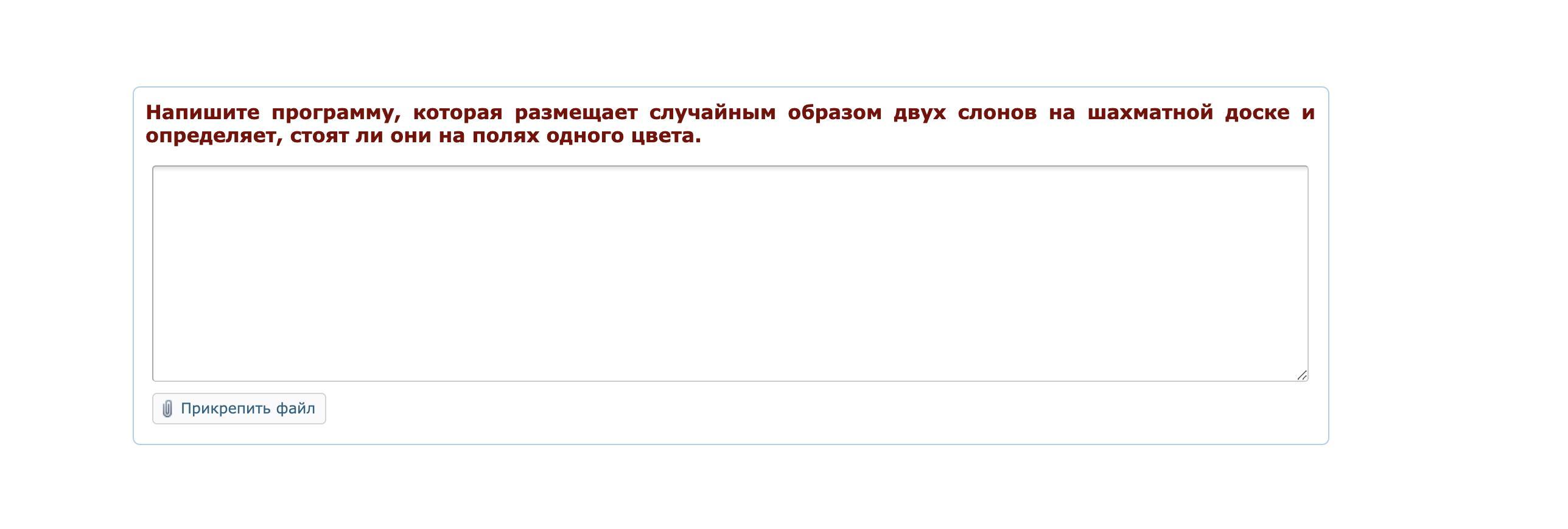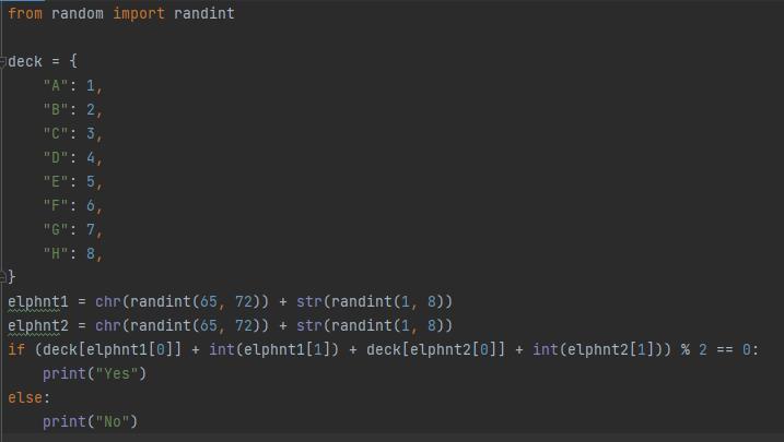 напишите программу которая размещает случайным образом двух слонов на шахматной доске и определяет, стоят ли они на полях одного цвета. (python) срочно!