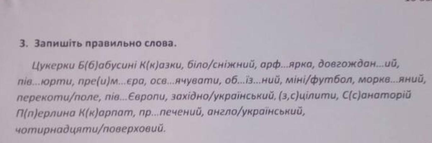 Цукерки «Бабусині казки». білосніжний, арф’ярка, довгожданий, пів’юрти, прем’єра, освячувати, об’їзний, міні-футбол, морквяний, перекотиполе, пів-Європи, західноукраїнський, зцілити, санаторій «Перлина Карпат», припечений, англо-український, чотирнадцятиповерховий.