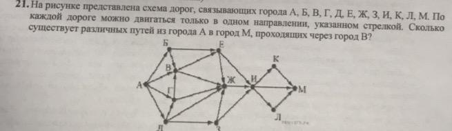 Необходимо найти количество различных путей из города А в город М, проходящих через город В.