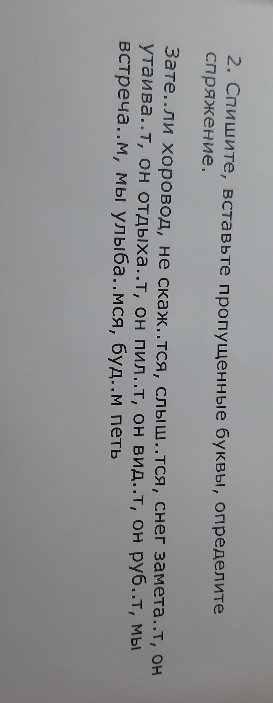 2. Спишите, вставьте пропущенные буквы, определите Спряжение. Зате..ли хоровод, не скаж..тcя, слыш..тcя, снег замета..т, он утаива..т, он отдыха..т, он пил..т, он вид..т, он руб..т, мы Встреча..м, мы улыба..Мся, буд..м петь