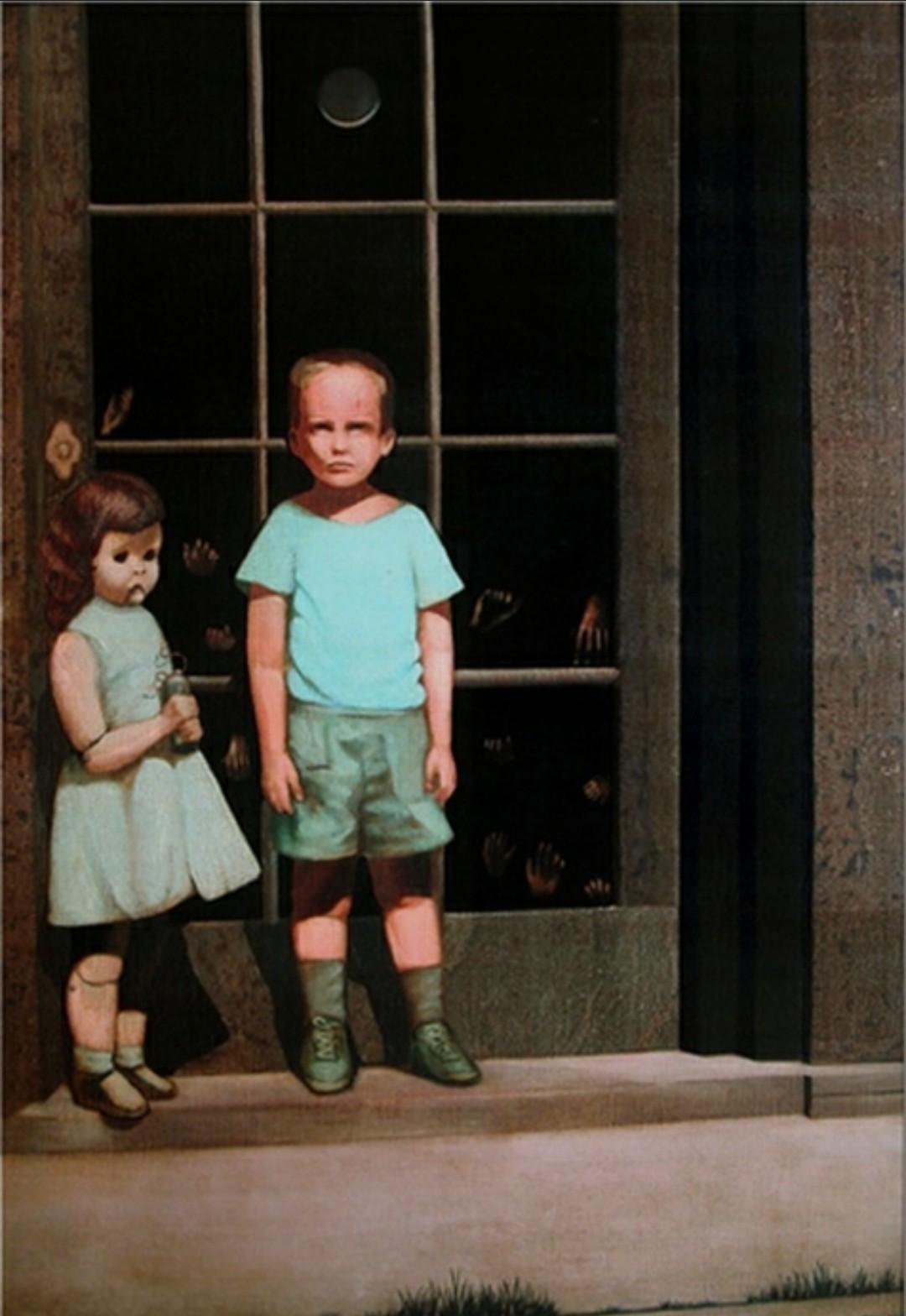 на цій картині зображено, як хлопчик і лялька стоять біля кімнати. В хлопчика сумний і серйозний погляд, отже його засмутила якась погана подія в житті. Лялька тримає в руках якусь дивну детяль від свого механізму. Вона виглядає майже як жива людина. А моде це і є жива людина. На ній зеленувата сукня та коричневе взуття. Хлопчик в бірюзовійфутболці та зелених шортах. На ньому чоботи на зашнуровці. Вони стоять коло дверей, за якою.........(о господи, там руки, там багато рук, я тільки зараз помітила). Я так розумію там зомбі-апокалипсис і вони сховалися в будинку. За дверима вулиця, тому що є місяць. В дітей сумний погляд бо влни розуміють, що можуть померти.