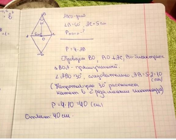 Тут скорее всего необходимо найти гипотенузу (что будет одной из сторон ромба) внутреннего прямоугольного треугольника, по стороне(диагональ деленная пополам) 5 /2 = 2,5 см и противоположному углу 180° - 90° - 30° = 60°(где 30° данный угол деленный пополам, данной диагональю). Вопрос про какой класс очень уместен в комментариях, ибо данный метод решения будет включать синус угла 60°, что составляет 0,86 (0,866). По формуле с = а / sin(A), где с-гипотенуза, а-катет, и синус противоположного от катета угла, получим с = 2,5 / 0,86 = 2,9см. (округленное значение длины гипотенузы 2,88см).