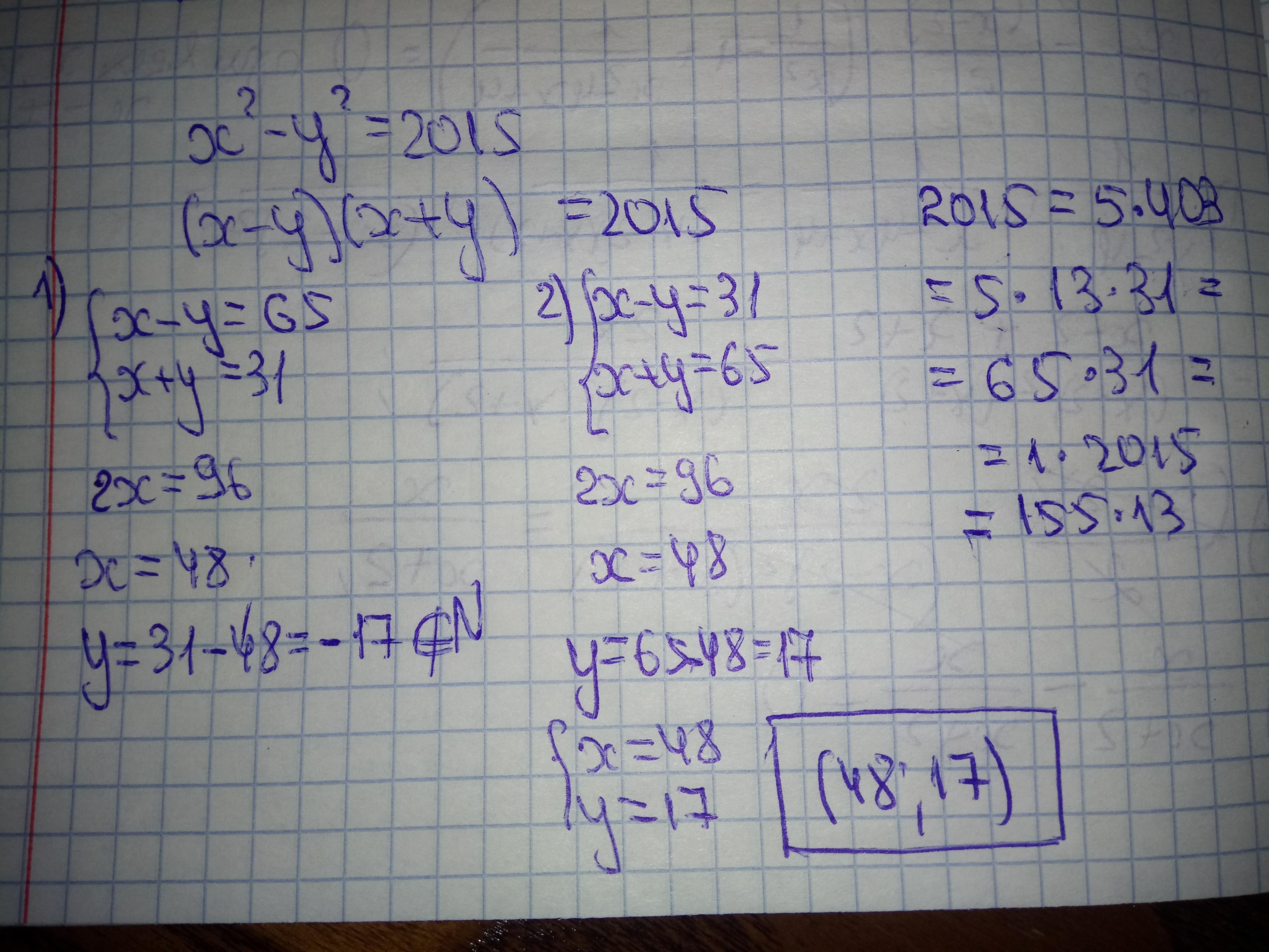 Розв'яжіть у натуральних числах рівняння х^2-у^2=2015