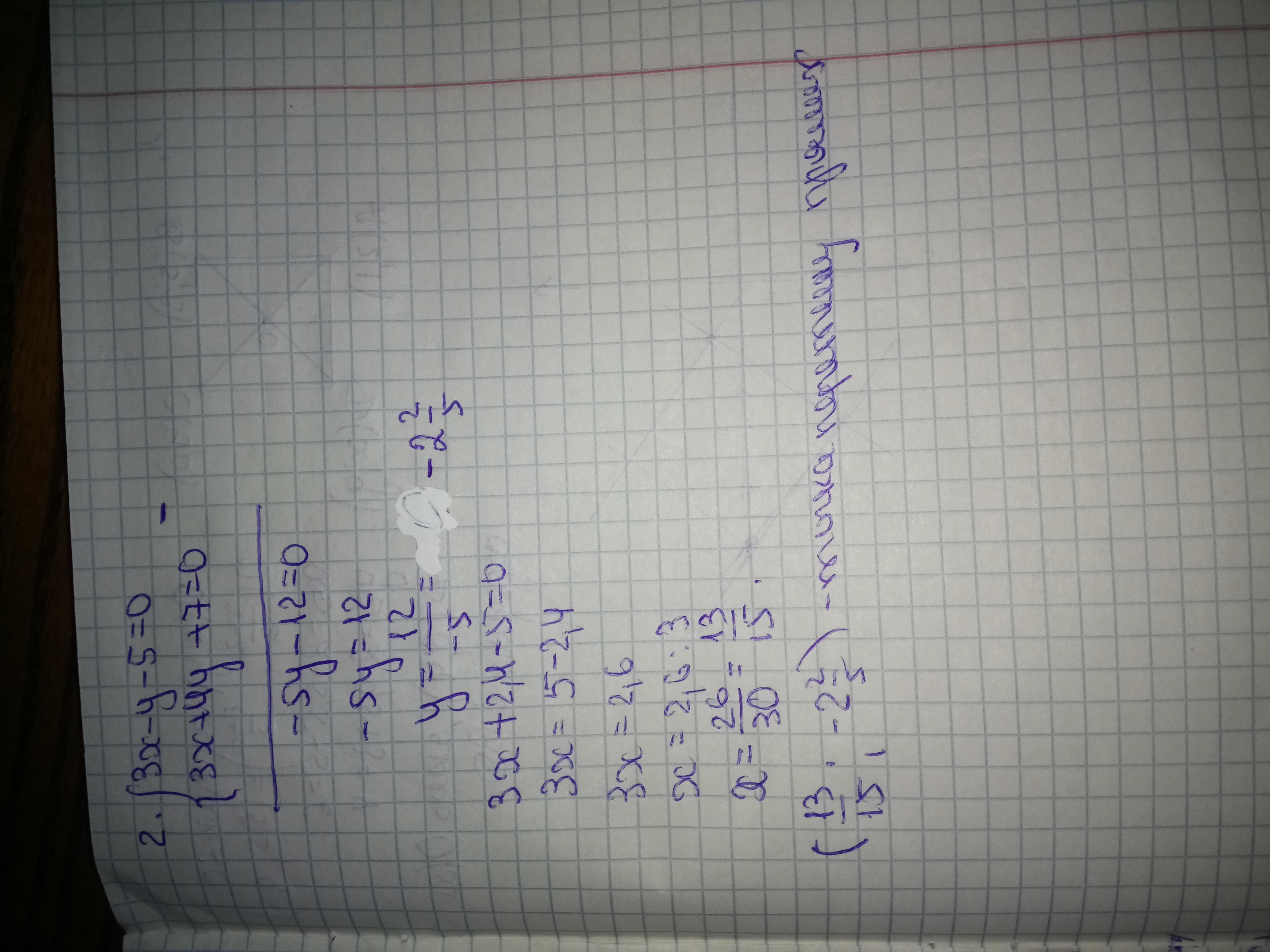 2. Знайдіть точку перетину прямих, заданих рівняннями: Зx-у -5=0 і 3х +4y +7=0.