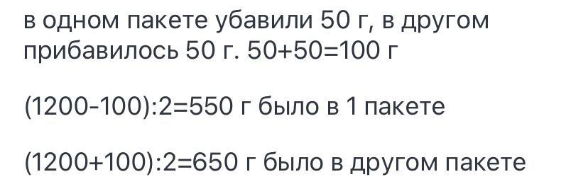В двух пакетах было 1.200 г конфет. Когда из одного другой переложили 50 г, то пакеты стали одинаковой массы. Какова масса пакетов в начале? Решение: 2 ч. 10 мин. Даю 11 баллов.