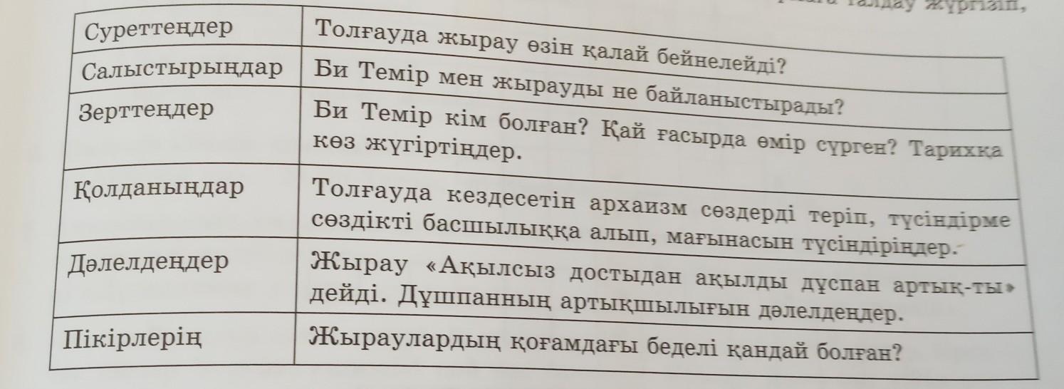 Суреттеңдер Салыстырыңдар Зерттеңдер Толғауда жырау өзін қалай бейнелейді? Би Темір мен жырауды не байланыстырады? Би Темір кім болған? Қай ғасырда өмір сүрген? Тарихқа көз жүгіртіңдер. Толғауда кездесетін архаизм сөздерді теріп, түсіндірме сөздікті басшылыққа алып, мағынасын түсіндіріңдер. Жырау «Ақылсыз достыдан ақылды дұспан артық-ты» дейді. Дұшпанның артықшылығын дәлелдеңдер. Жыраулардың қоғамдағы беделі қандай болған? Қолданыңдар Дәлелдеңдер Пікірлерің