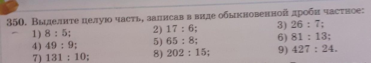 350. Выделите целую часть, записав в виде обыкновенной дроби частное: 1) 8: 5; 2) 17 : 6; 3) 26 : 7; 4) 49 : 9; 5) 65 : 8; 6) 81 : 13; 7) 131 : 10; 8) 202 : 15; 9) 427 : 24.