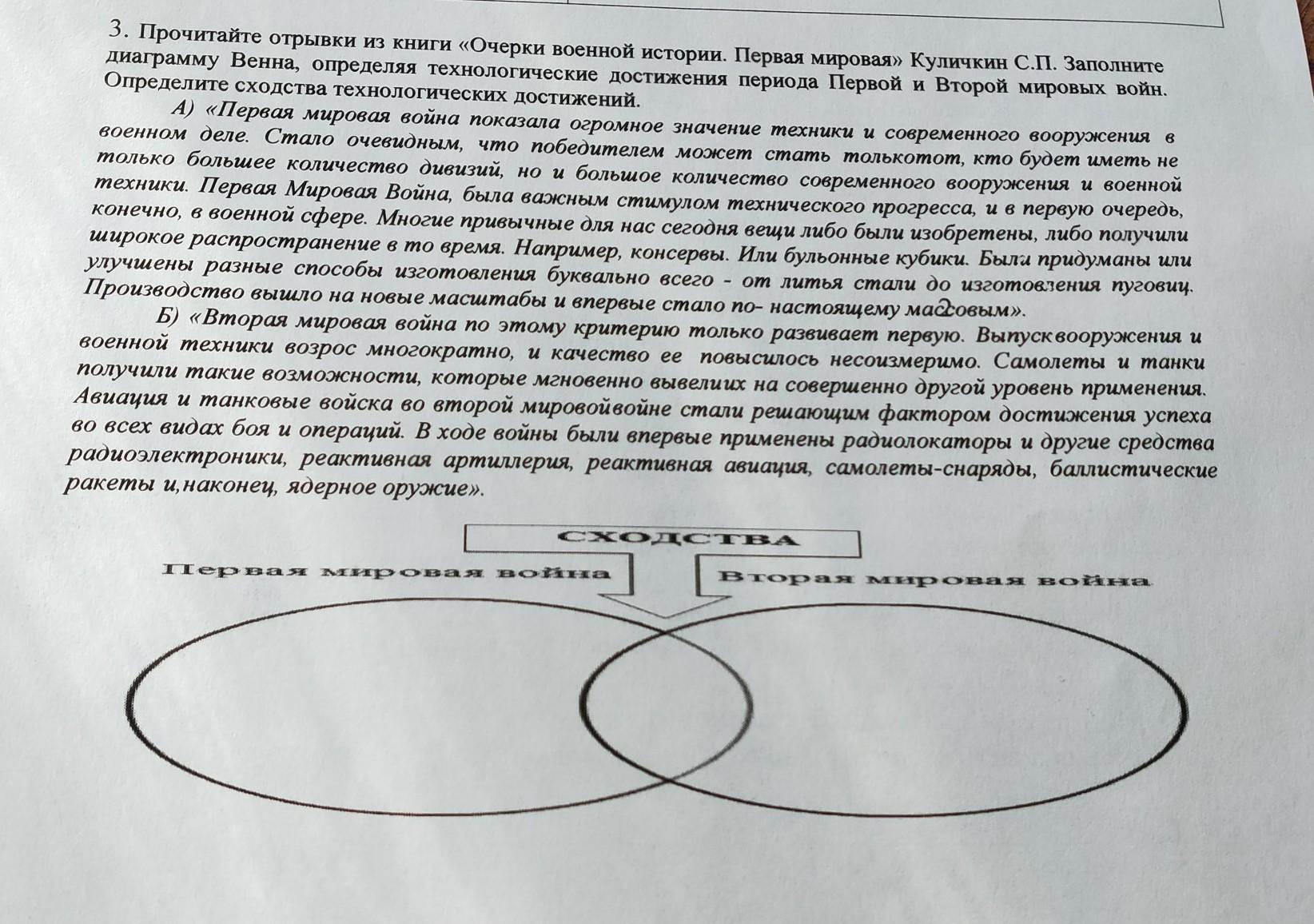 - 3. Прочитайте отрывки из книги «Очерки военной истории. Первая мировая» Куличкин С.П. Заполните диаграмму Венна, определяя технологические достижения периода Первой и Второй мировых войн. Определите сходства технологических достижений. А) «Первая мировая война показала огромное значение техники и современного вооружения в военном деле. Стало очевидным, что победителем может стать толькотот, кто будет иметь не только большее количество дивизий, но и большое количество современного вооружения и военной техники. Первая Мировая Война, была важным стимулом технического прогресса, и в первую очередь, конечно, в военной сфере. Многие привычные для нас сегодня вещи либо были изобретены, либо получили широкое распространение в то время. Например, консервы. Или бульонные кубики. Была придуманы или улучшены разные способы изготовления буквально всего от литья стали до изготовления пуговиц. Производство вышло на новые масштабы и впервые стало по-настоящему массовым». Б) «Вторая мировая война по этому критерию только развивает первую. Выпуск вооружения и военной техники возрос многократно, и качество ее повысилось несоизмеримо. Самолеты и танки получили такие возможности, которые мгновенно вывелих на совершенно другой уровень применения. Авиация и танковые войска во второй мировой войне стали решающим фактором достижения успеха во всех видах боя и операций. В ходе войны были впервые применены радиолокаторы и другие средства радиоэлектроники, реактивная артиллерия, реактивная авиация, самолеты-снаряды, баллистические ракеты и, наконец, ядерное оружие». сходства первая мировая я война вторая мировая война
