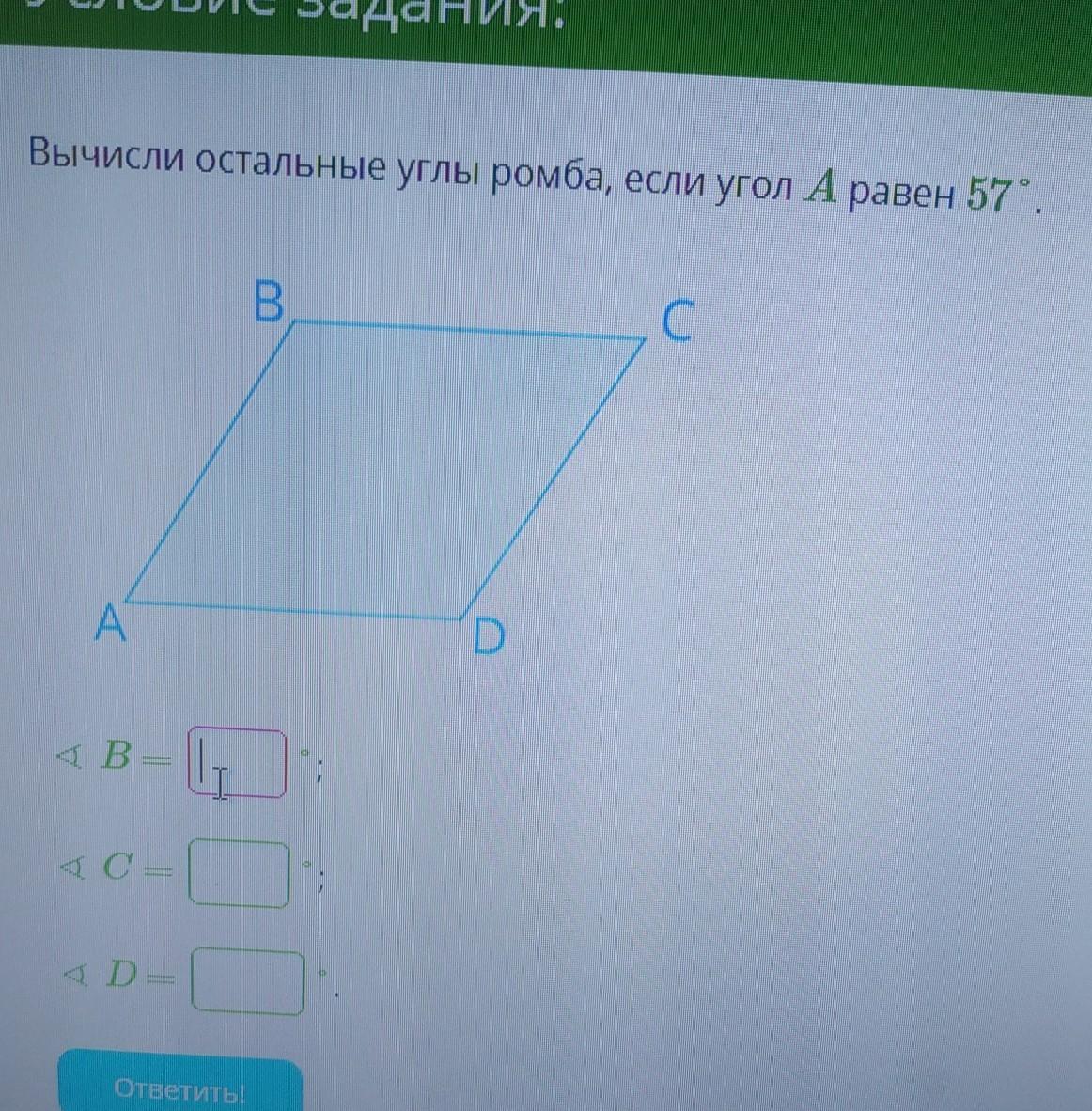 В ромбе противоположные углы равны. Угол A противоположен углы C, значит угол C = угол A = 57°
