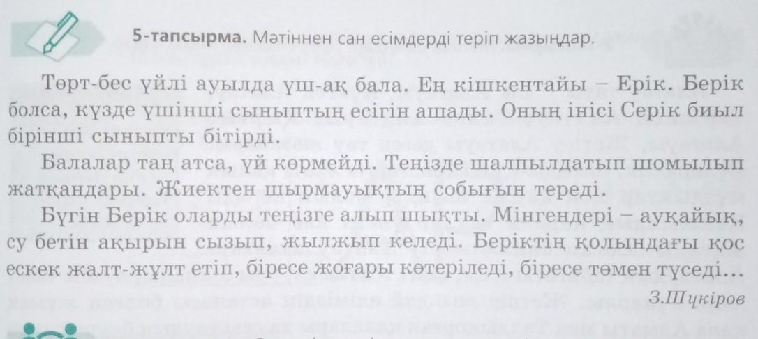 Задача 5. Введите цифры из текста. Трое или трое белых детей в деревне из четырех или пяти домов. Самый младший - Эрик. Если он сильный, то осенью откроет дверь в третий класс. Его младший брат Серик в этом году окончил первый класс. Если дети удивятся, они не увидят корову. Они купаются в море. Срывает с края стебли плюща. Сегодня Берик отвез их к морю. Гонщики медленно двигаются, царапая поверхность воды. Сверкали два весла Берика, одни взлетели, другие опустились. 3. Шукиров.