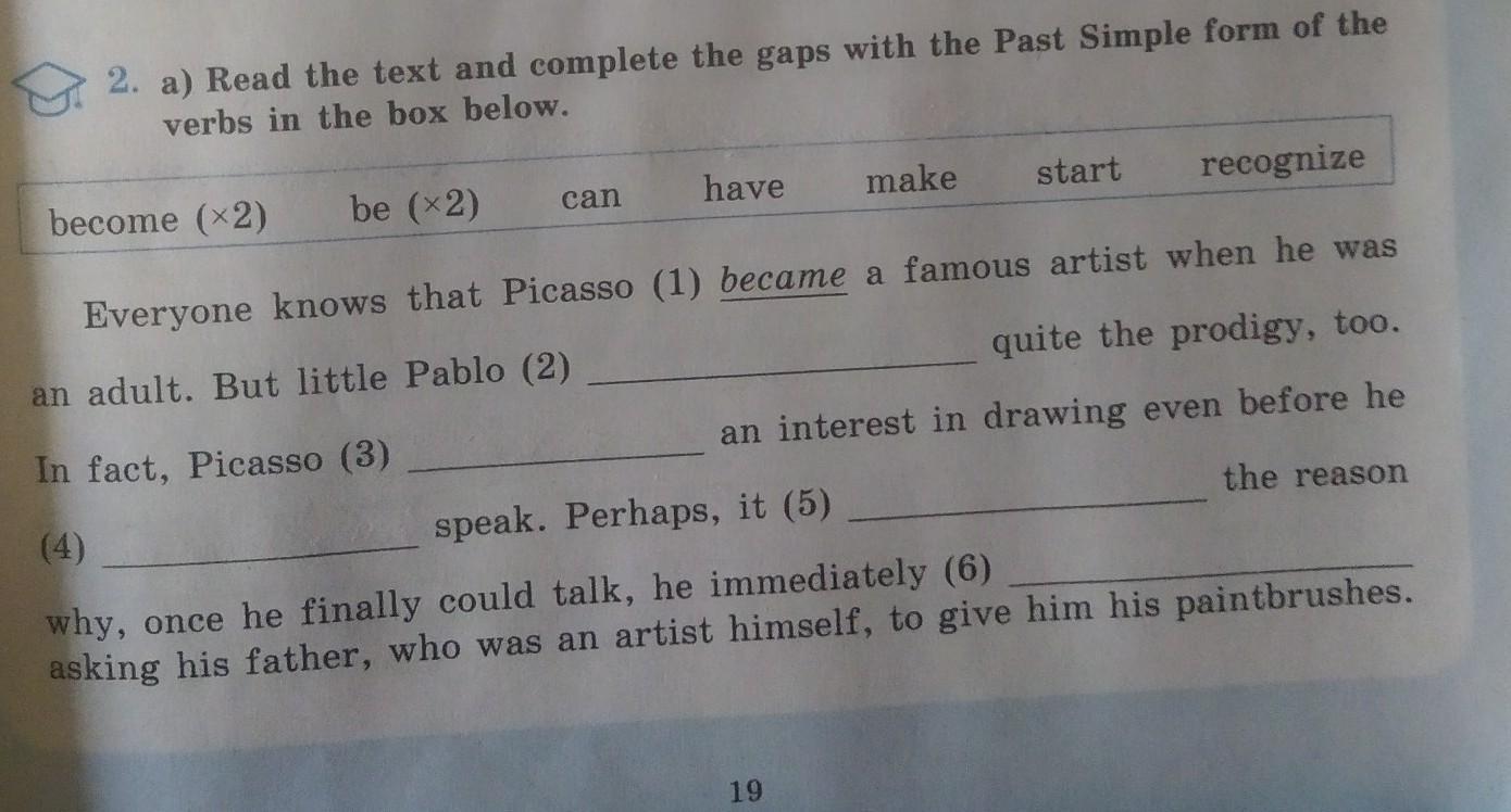 Everyone knows that Picasso (1) became a famous artist when he was an adult. But little Pablo (2) _____quite the prodigy, too. In fact, Picasso (3)____ an interest in drawing even before he (4)____ speak. Perhaps, it (5)____ the reason why, once he finally could talk, he immediately (6)____asking his father, who was an artist himself, to give him his paintbrushes.